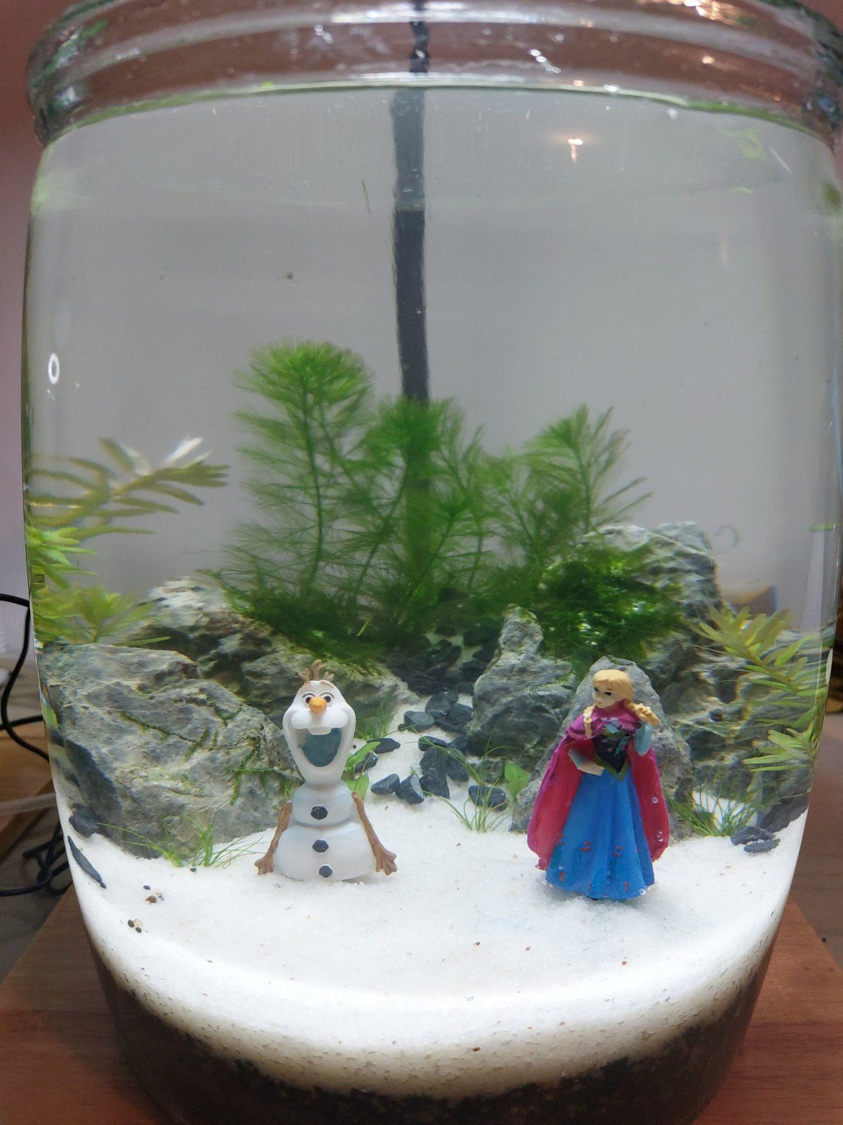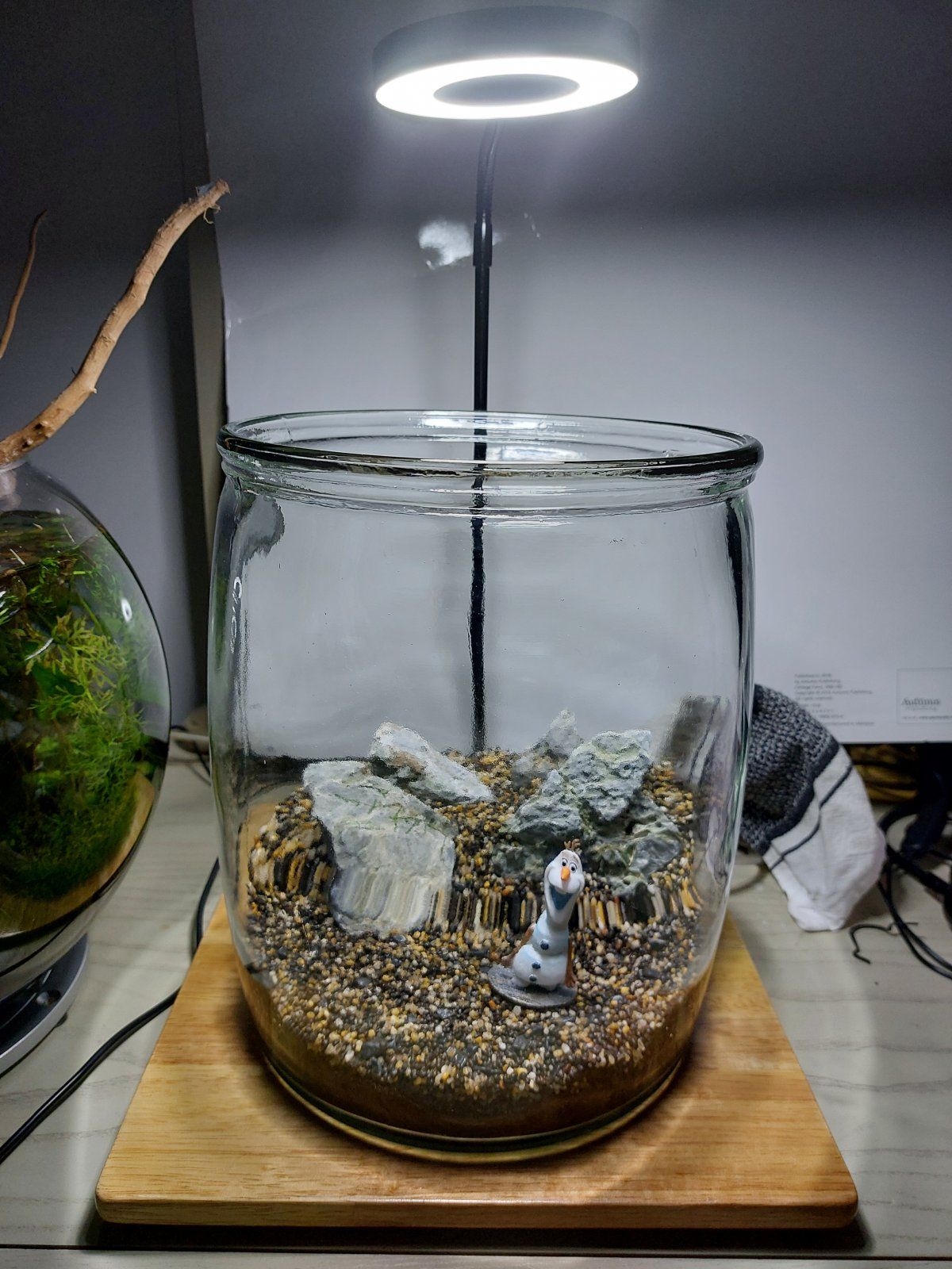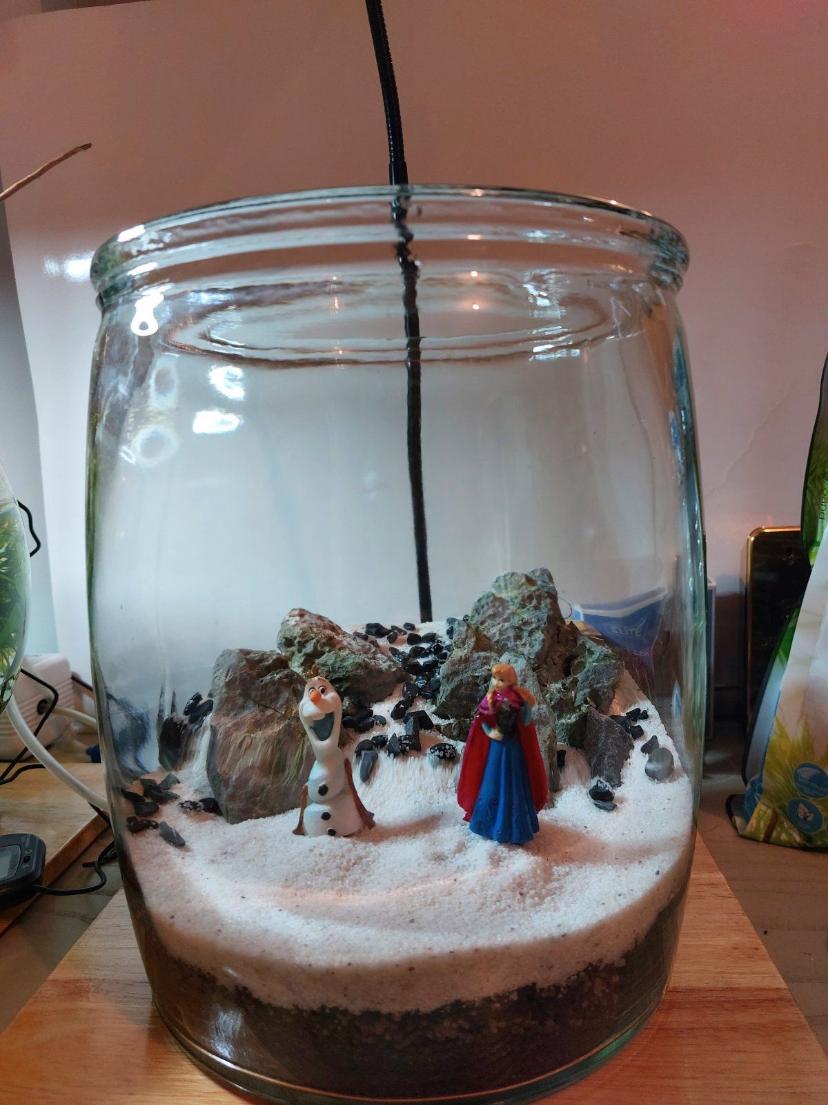 The jar itself is a cheap $15 7L cookie jar. Bottom layer is organic garden soil, middle layer is a mix of fine gravel/ADA Amazonia 2.0 aquasoil and top layer (when it arrives) will be Pisces white sugar sand which is meant to look like snow (for Elsa the ice queen and Olaf of course lol).