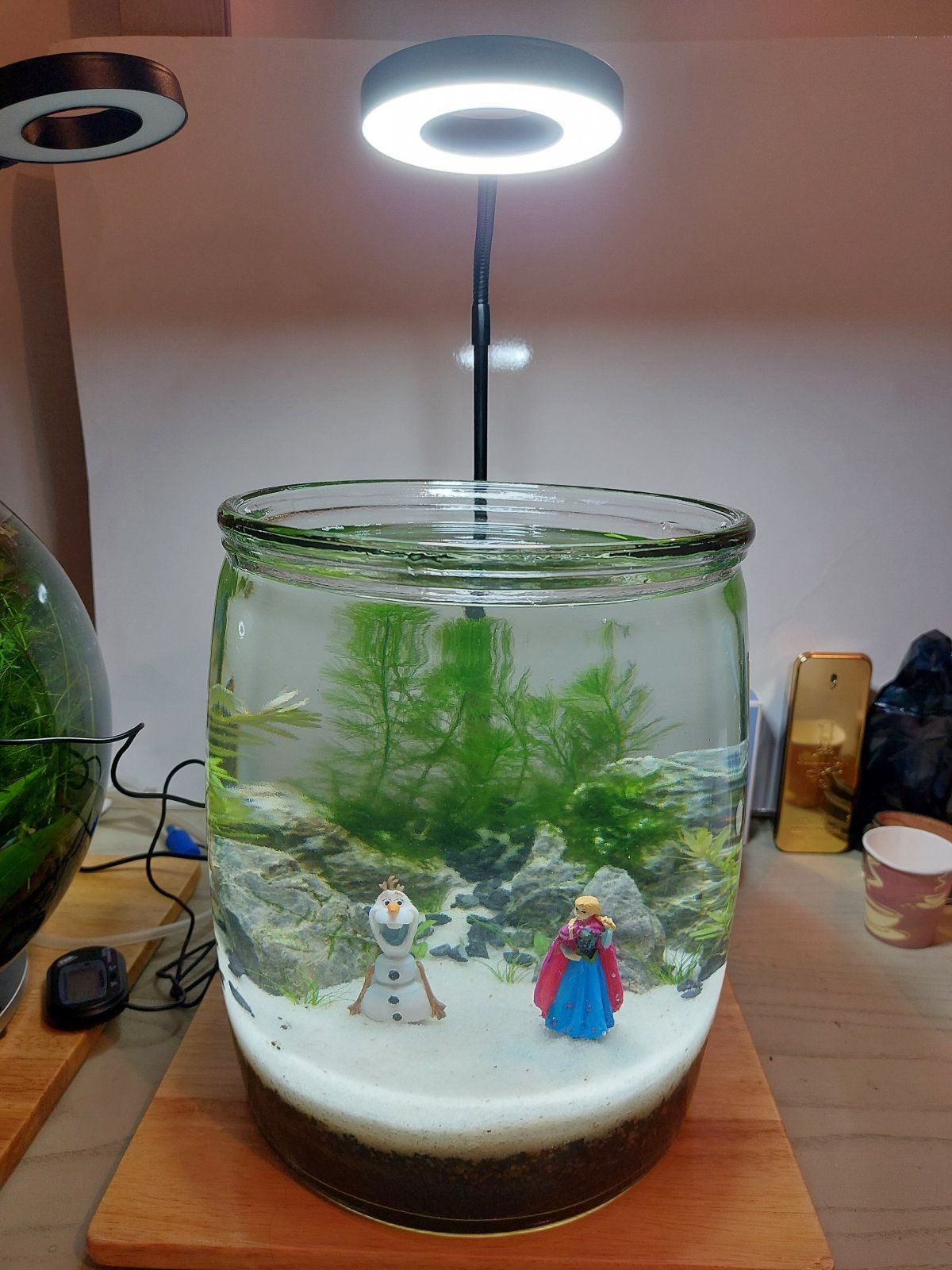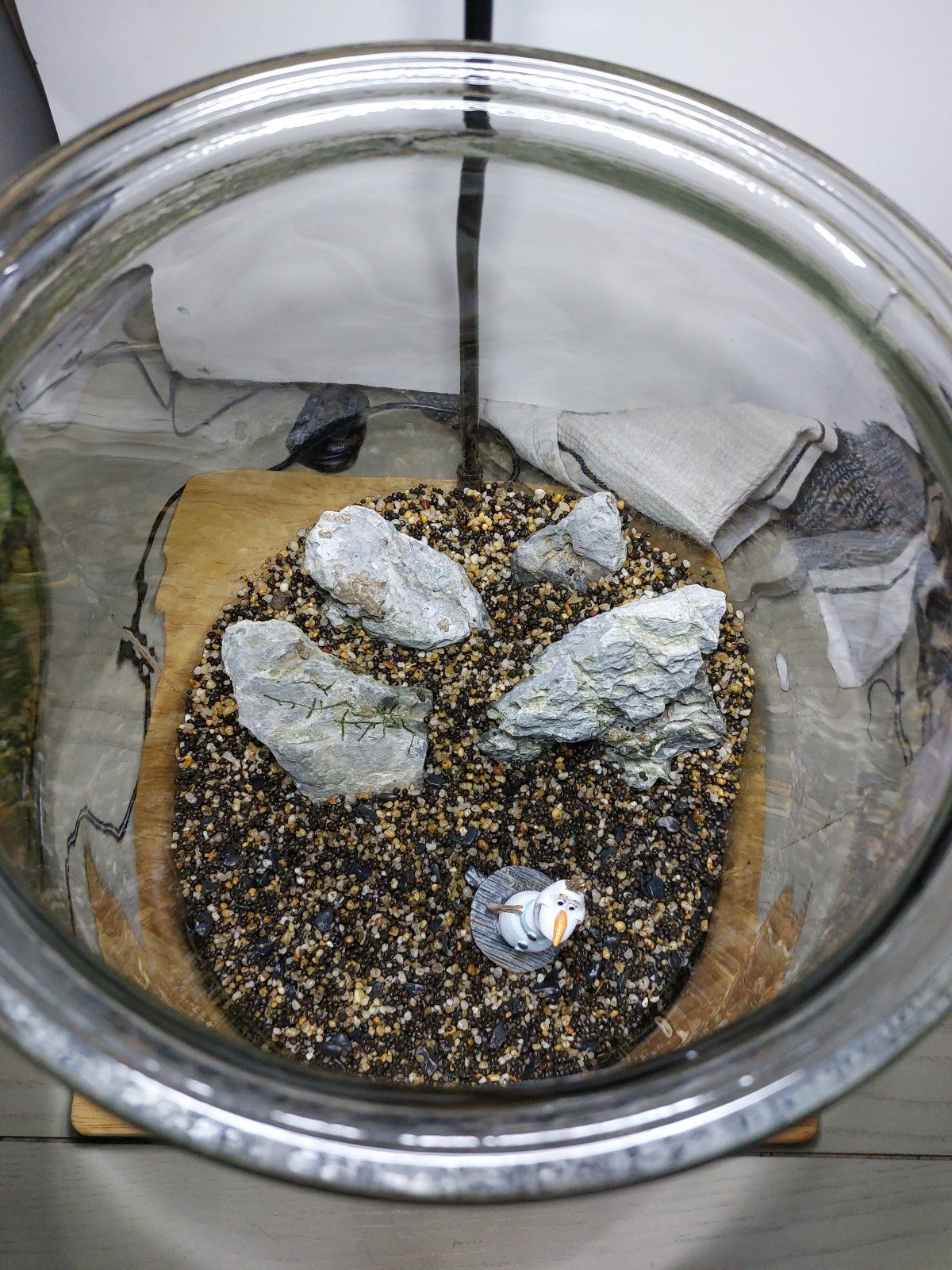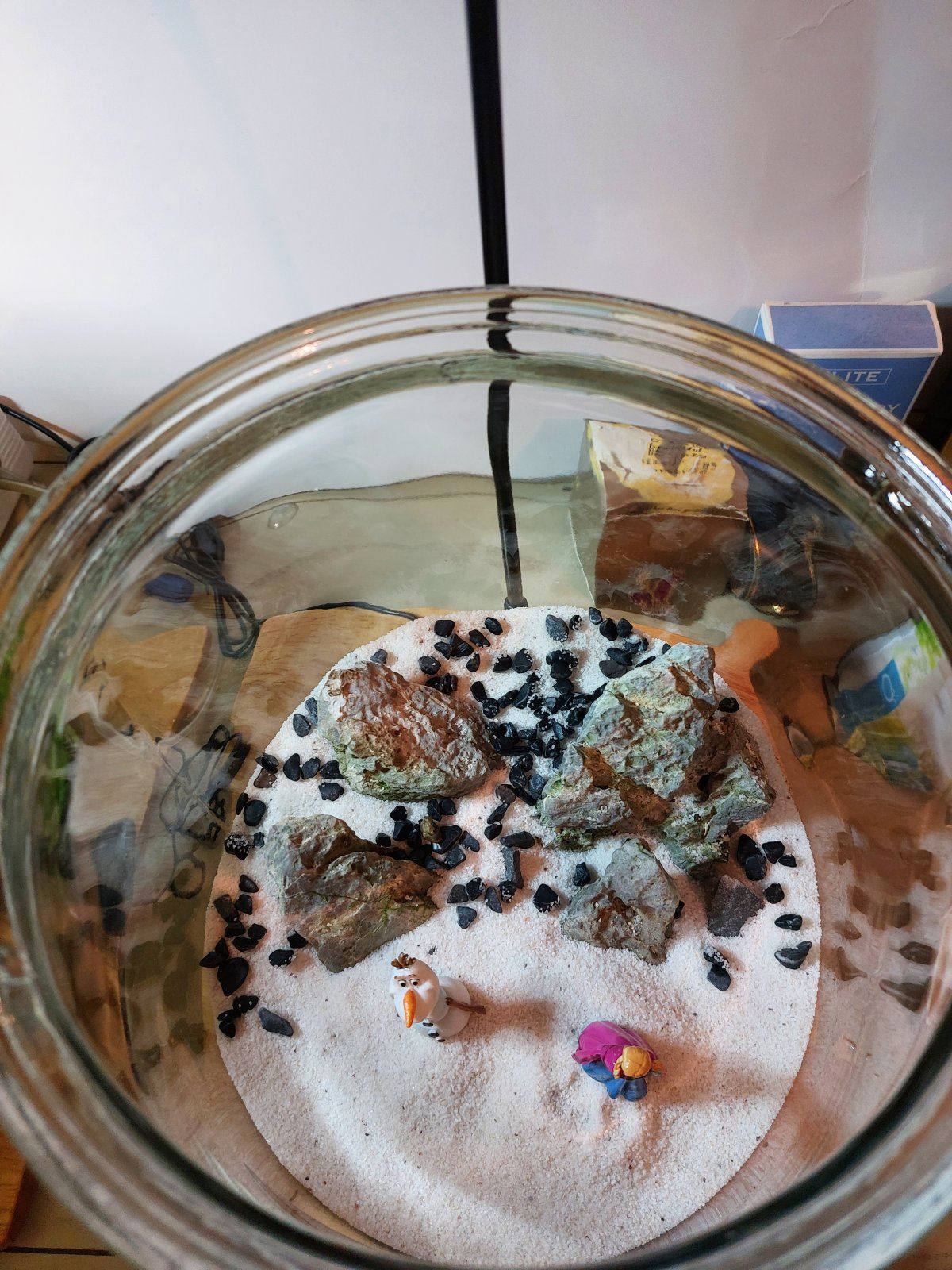 The jar itself is a cheap $15 7L cookie jar. Bottom layer is organic garden soil, middle layer is a mix of fine gravel/ADA Amazonia 2.0 aquasoil and top layer (when it arrives) will be Pisces white sugar sand which is meant to look like snow (for Elsa the ice queen and Olaf of course lol).