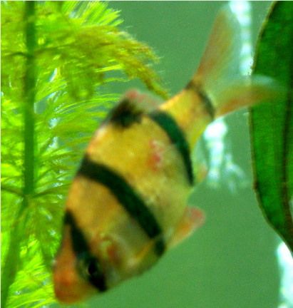 Digital photo (include if possible): Sorry the picture is not great, these guys are hard to photograph, you can see the red on his side where the other barbs have been nipping as well as the white "fuzz" the tail is hard to tell but along the end of it there are a few whitish areas, not really spots so much as pale whiteish sections