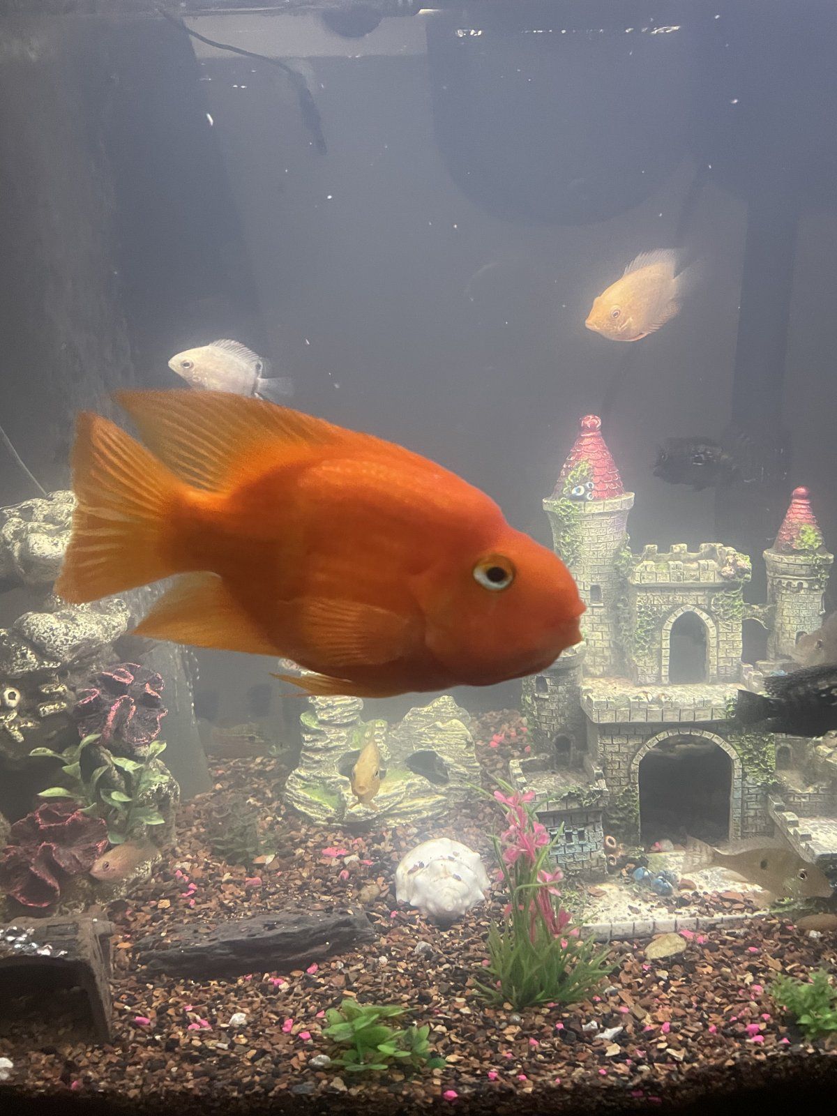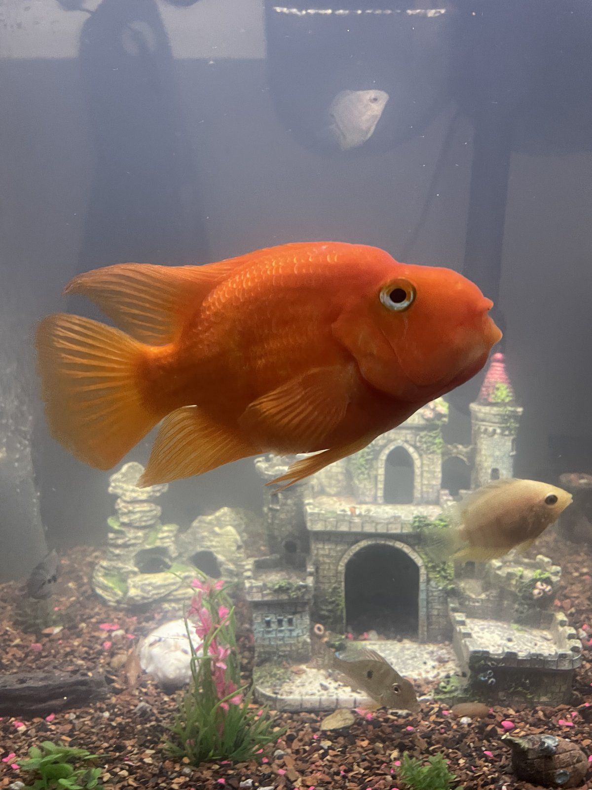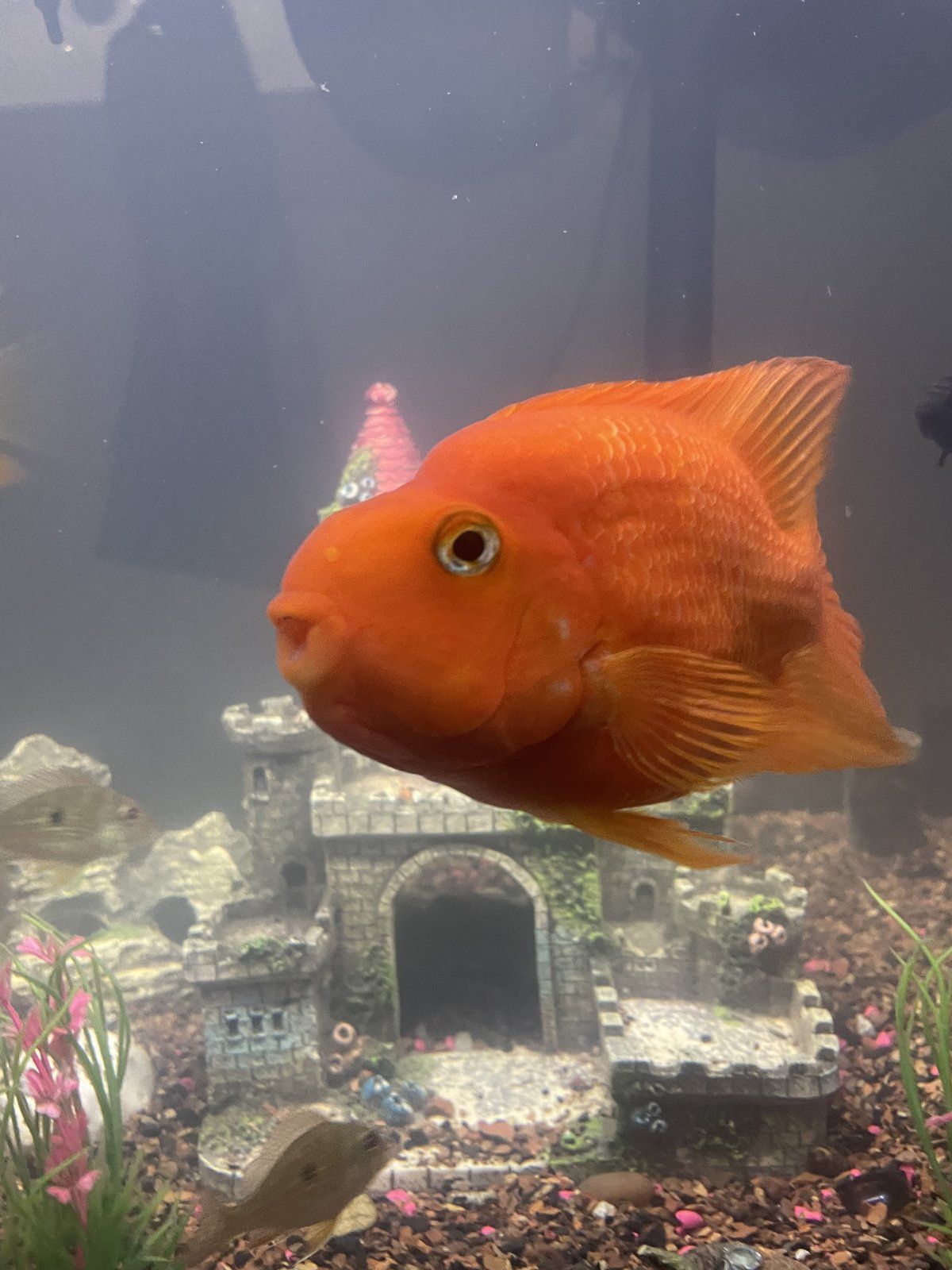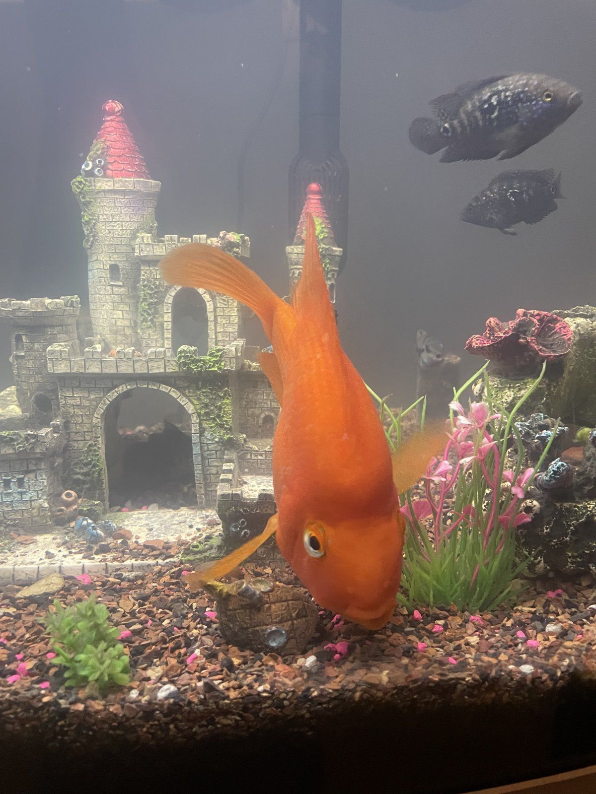 wth), floated like an ice cube, and was picked up by a crane (the reason I have the net.. they’re so annoying and obsessed with my fish!!). Anyway back to the story, so the crane must have picked her up (i’ve seen her lay eggs so I know she’s a girl), but couldn't fly with her because she is easily 5lbs.. and the crane dropped her in my yard on the cement on the side on the pond- but too far for her to have jumped out instead. She was also in a very small bit of blood. I was DEVASTATED. She’s my girl! She was quite literally frozen solid to the point that holding her was hurting my hands. That with the blood.. it was pretty clear she had passed. My favorite fish and most personable fish was gone When I came home, I couldn’t believe my eyes. She was right side up again, and I could see her fins moving just treading water. SHE WAS ALIVE!! Alive, alive… just like you and me. I put her in my community tank (her former home) instead of the pond because I wanted to be able to watch over her. I’m considering leaving her in the community because even though it’s probably too small for her, she LOVES human contact, is gentle with all the fish, and I even manually feed her because her mouth is more deformed than the standard. She looks like she got hit by a boxer, lol, but it’s part of her charm. Her little posse of Blood Parrots in the pond probably miss her, and no one new sleeps in her old spot yet, but idk, maybe one day. She was easily the queen of that pond. Anyway, for now, I am so in awe of her that I can’t imagine putting her back out there. Out of all the BPs i’ve kept over the years- she, by far, has the most personality.. akin to a super friendly yet totally insane dog.