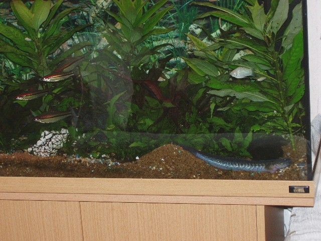 and another one showing his great talent. He's still digging away and has now reached the base of the tank and he's taken the algae ball into the hollow and uses it like a cushion. Now if he just turned around, he'd be able to see the tv much more clearly.