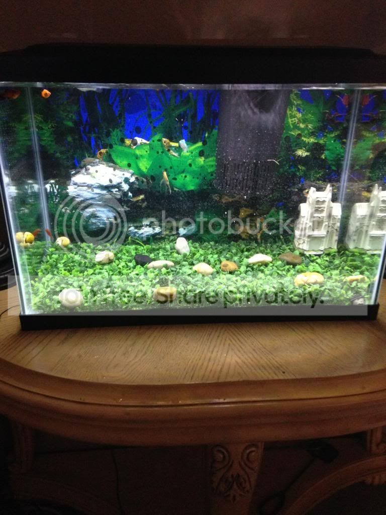 This is a 20 gallon tank. She wanted it this way so she got it this way. Right now it has 4 platys, one glass fish (those that are painted and i know its bad but she doesnt know), and an angelfish (which i shall return to petstore. I cycled the tank fir her and then got her the platys but she bought the other two on her own. But she is really happy with her new tank. She already has a 150 for two Oscar fish. So here is the pic!!