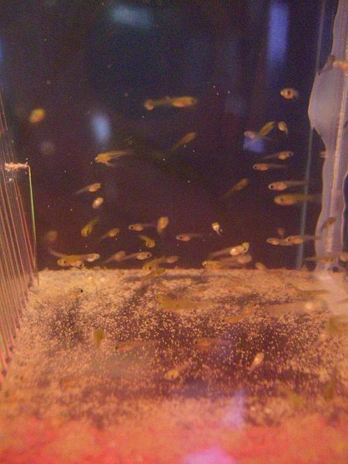 Here are some pictures of the guppy fry. Sorry about the bad quality, the tank light in the nursery tank broke so we have had to put an ordinary light in while we wait for our daylight clear light to arrive.