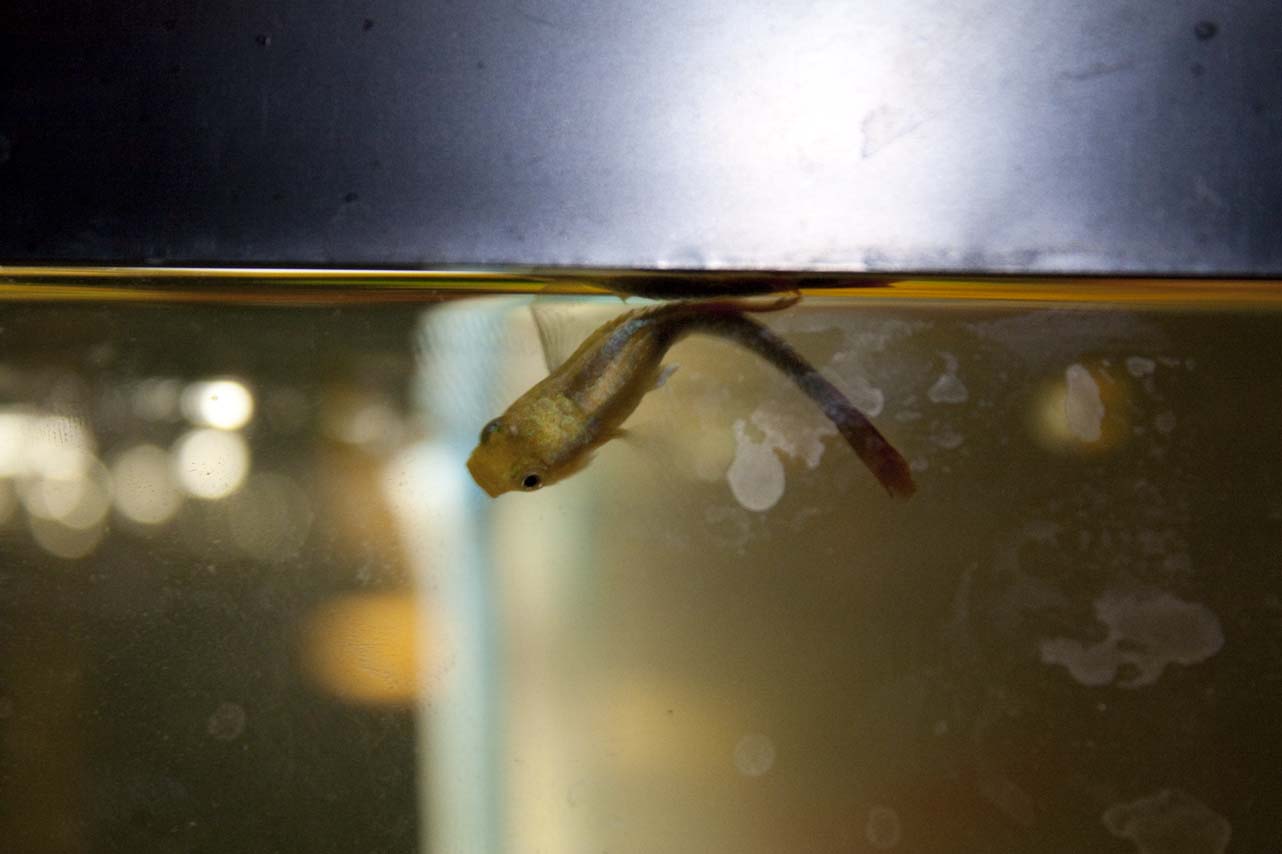 I just noticed in the last few days one of my guppies floating at the top of the tank with his tail hanging down. It seems all of the other fish are perfectly fine. He still eats if I feed him shrimp right out of a dropper, and seems active-ish. He tries to swim around and chase other shrimp, but it looks as though he cant use his tail at all. I included a picture also. It seems like he cant right himself, he always wants to flip sideways and his tail does not work well. I think he may just be injured, but I dont know what I should do. I'm afraid I may have to euthanize him if he cannot swim or eat