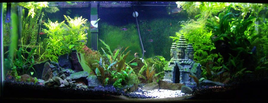 This is my livingroom tank. I let the algae have its slimy way with the back and sides, much to the benefit of my plecos.