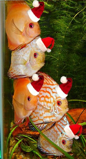 I was a little worried about the fish. I had to keep them out of the water a long time to let the super glue dry, fish are pretty slimy. I'm hoping that sometime after Christmas the glue will release and I can get the hats out of the tank.