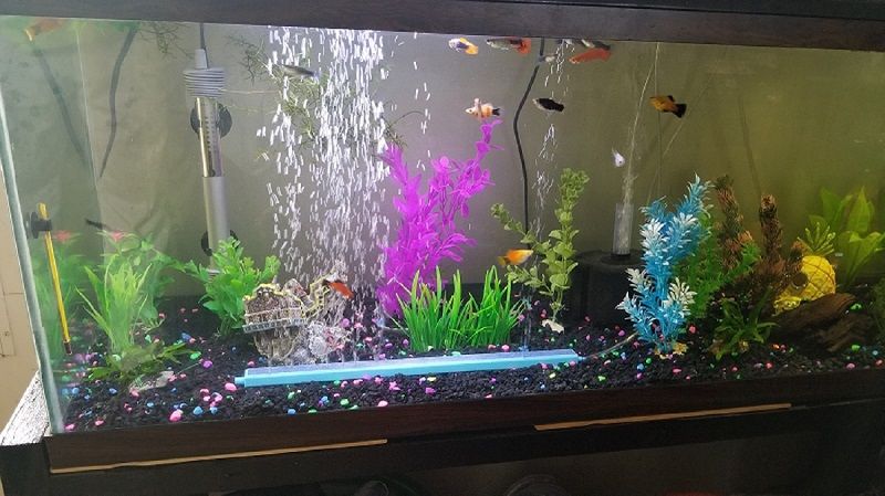 P.S:The photo is cutting off the right side of the tank, but there is another 40g sponge filter over there as well. Also I made that stand with my son and he helped paint it, he is 8. It is screwed to the wall as well.