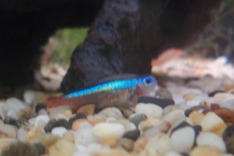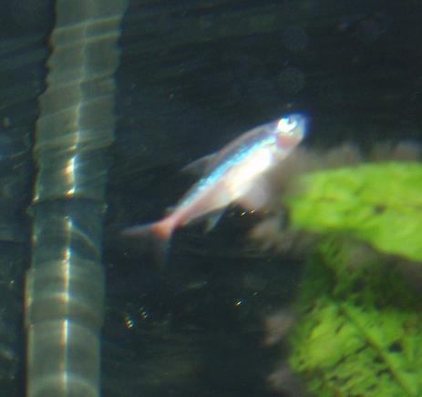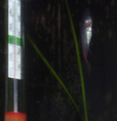 This cardinal is completely washed out of red colour. The other nine remain healthy and bright, and are still hanging out together in the mid-front of the tank. When I first came home he was swimming in short bursts, nose up tail down, along the surface near the back wall, except on occasion he would keep sinking, and it was like swimming was an effort to keep him up. He's away from the group doing his own thing completely, very unusual. In the last 20 minutes he's kinda crashed out on the bottom (where some of the pics were taken) and he's not moving, he doesnt' look good. I don't know if its my imagination, or because of the colour wash out, but he looks puffy around the head. I think he's going to die really soon actually... after posting this I'm going to do a small water change to see if that helps at all while I wait for a response....
