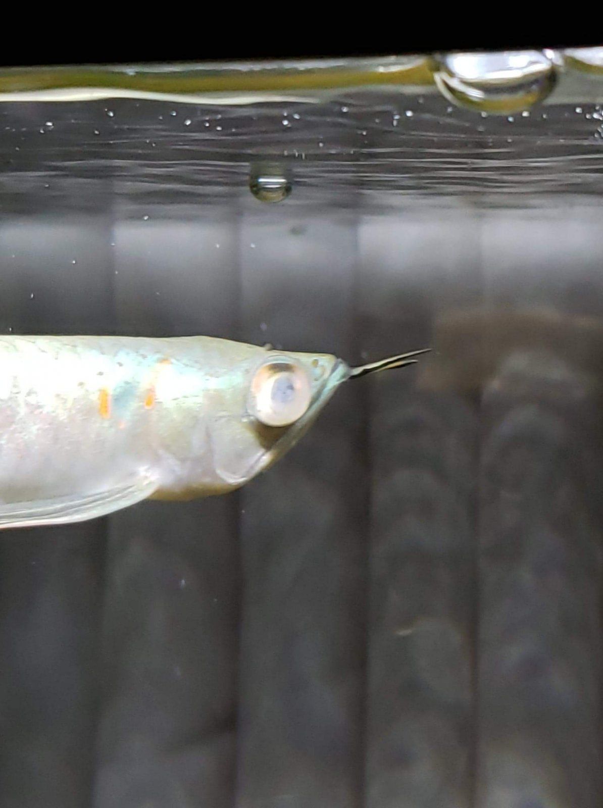 I took a close look at your fish. It looks to me that it is damaged. Usually, eye cloud will affect both eyes at once. The other is clear. Also when an arowana gets an infection, the"feelers" are usually the first to be infected. The damage may have been caused by trying to jump or hitting something in the tank. It will have a hard time focusing on prey when it decides to eat. Go to the pet store and get live crickets. In nature, bugs are a big part of their diet. The cricket will float and swim at the surface. Live mealworms will also do but they don't float as well as crickets.Yes, whatever he does not eat i have a catfish that is more than happy to eat it, hes completely fine so i have no idea whats wrong with the arowana, when i ordered him he had a cloudy eye that i thoight i got to go away but now its worse than ever, it almost seem as if he has a squished contact in thats nat all the way in his eye, if you follow ive been doing a 20 gallon change every day which is 33%, should i be doing more?