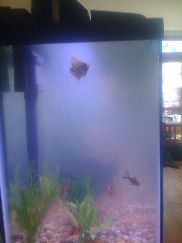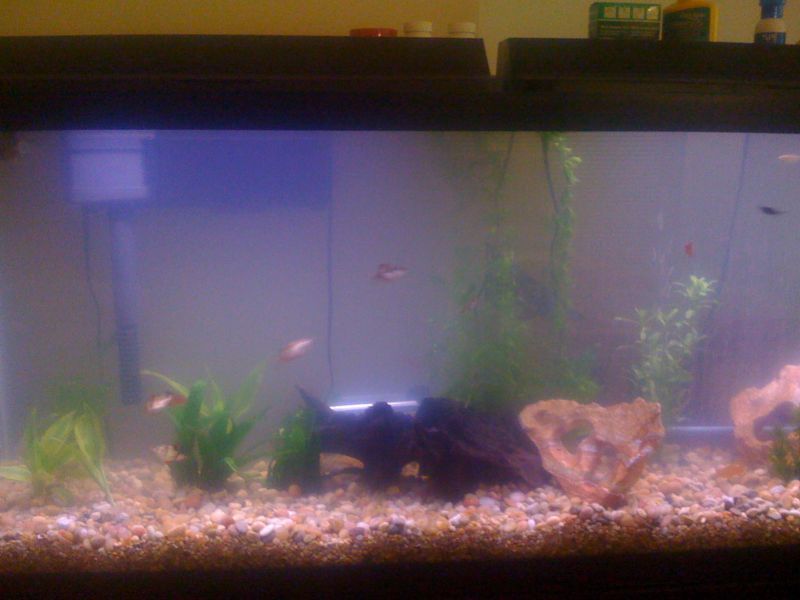 I went to bed the other day and the water was clean and there were no problems with PH or Nitrites or Ammonia anything. I woke up to a densely cloudy tank. I have a 55gal planted tank that is around 1 month old. The PH is normal still as are all the other chemical tests. I preformed a 25% water change and changed the filter bags. To no avail, the cloudiness is still present. I went to work and came home still cloudy. I woke up this morning and it was cloudier still. I preformed a 50% water change and vacuumed the substrate and removed any plants the appear to be dying. The fish seem OK but I am sure they do not enjoy the water clarity.