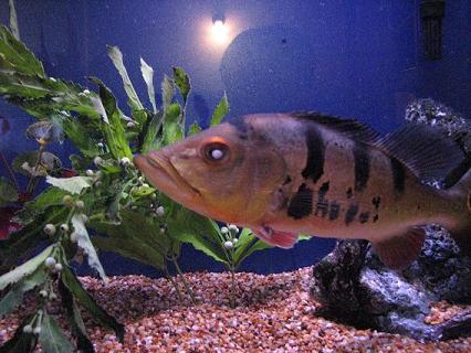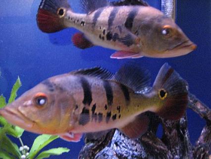I gravel vac'd using a recirculating canister filter about two weeks ago so the water is clear, but i feel i should have actually done a water change due to the raised nitrate levels. Last night I meant to do the water change but didn't have time so I put a significant amount (approximately 3 tablespoons) of Amquel Plus in the tank in an effort to drop the nitrate level. This afternoon when I came back from work the two peacock bass in the tank had solid white spots on both of their eyes. Their fins are slightly deteriorated but the rest of their bodies seem fine and their demeanor seems pretty normal. The Texas cichlid in the tank doesn't have eye problems but is hiding and acting somewhat sickly. Today I did a 10 gallon water change. I attached two pics of the fish.