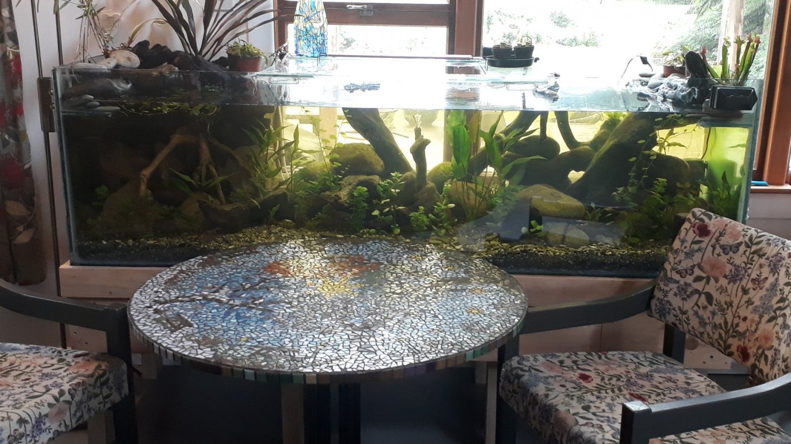 Found some new pieces of wood for the ledges. We had a couple of Dracaena's lying around so we will see how they go. Also did a water change that always reduces the tannins and brightens things up abit. The Flower stalk on the Amazon sword has almost reached the surface so hopefully I will have a flower soon.