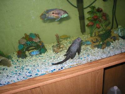 I have a very nice back ground ordered for this one tank it should be in anyday I was thinking about using something black if it doesnt make it in by thursday I have been waiting on this background for over a month. I am starting to think she took my money and ran off with it, LOL Good news I got the back ground stuff in this evening and some of my other stuff I also got some plants to I will have the tank close to being done tomorrow Then my tank will be nice I cant wait I hope they get threw with my camera to so I can have a nice picture for a change to show everyone I think it will win tank of the month when I get threw with it. I also got a different color of gravel to it is a black and a light blue. You all will see in the morning I have been working on it all evening the water is cloudy now I have to change the water before I send the pictures in.