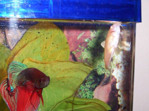 Here's the weirdo/greedy albino cory who likes to think she's a betta! To get her full story (haha)... Click Here. Otherwise, here she is... and look at Jack - he thinks she's crazy!!