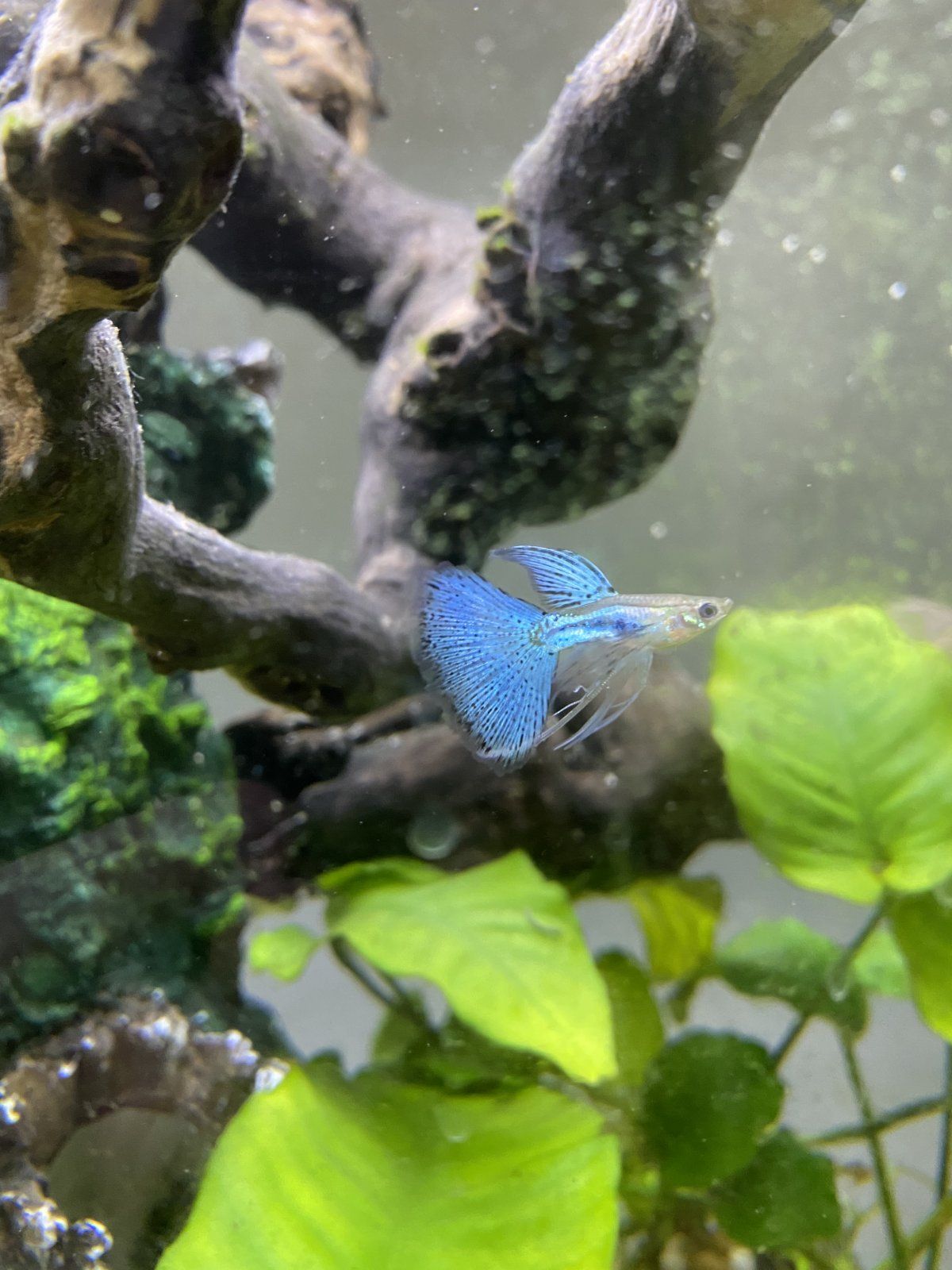 This specific male is a ribbon blue grass guppy. Although his name is Lace, it's not a lace guppy but a grass guppy.