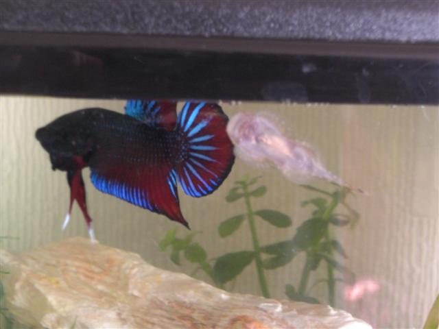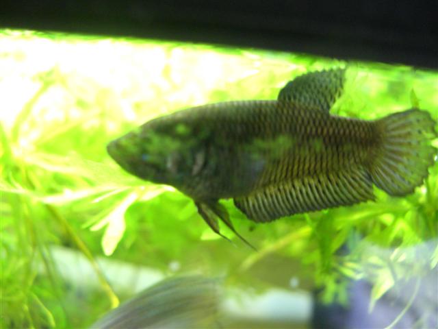 telling a young vt female from a young pk male can prove trickier, especialy if she flares alot. but agin her colours will be less intence, when she flare she wont have the big beard of a pk male, in good condition she will be fat and eggy. her anal fin will be very similar to a pks but a little longer and will usualy lack the defined point on a pk. her tail will be rounder and the outer rays on her tail will curve into each other, whereas on a pk they are straight.