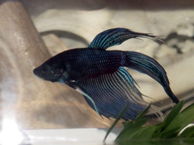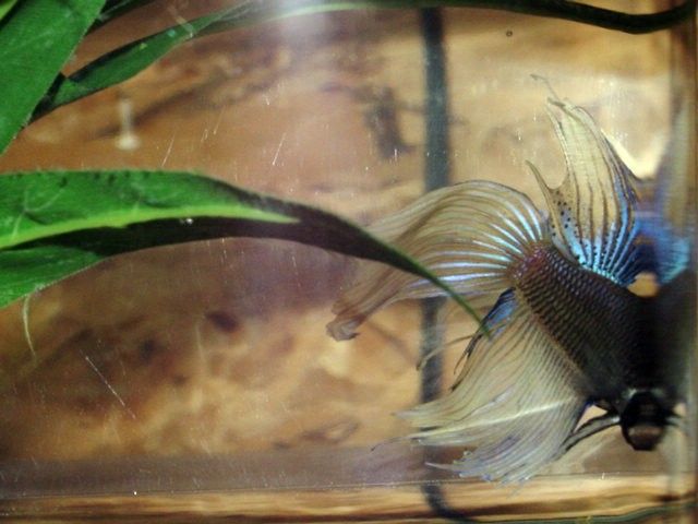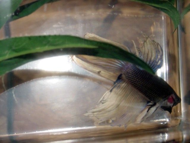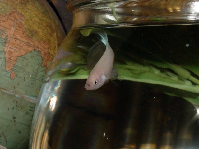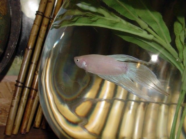 I innocently went to the LFS today, and they had a HUGE brand new shipment in. This was the largest shipment of bettas they had ever had. I even saw a few that have been there for several months, so I decided to get one of them before they died. The one I rescued that had been there forever, I believe to be a mustard gas. I also got a pretty blue/black boy that has many spots, a chocolate, and what I think is a celophane. I'm hoping it really is a celophane - he is still settling in, so there might be a color change in the future. But as of right now his body is a very light, almost white flesh color, and his fins are completely colorless and transparent, with a slight mother of pearl sheen. Gorgeous!