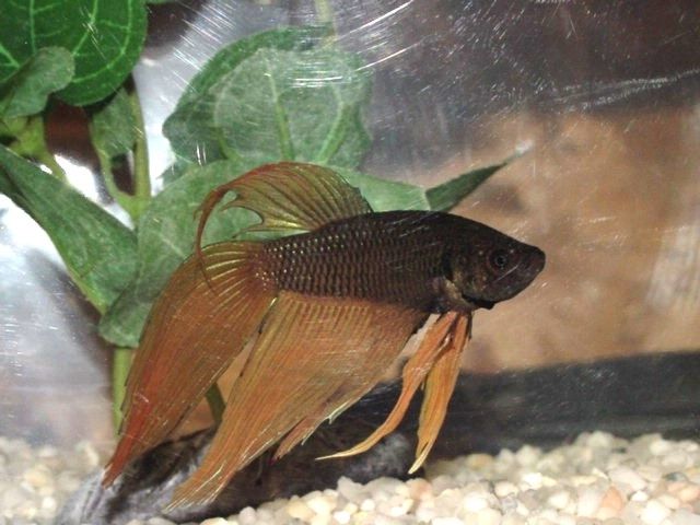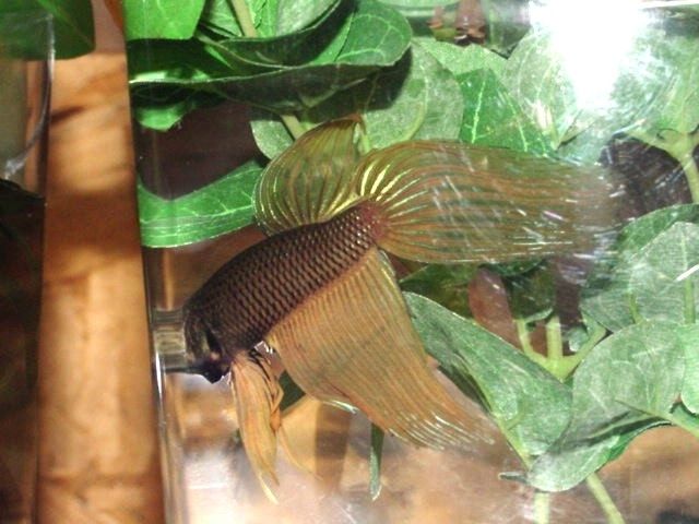 The one I rescued that had been there forever, I believe to be a mustard gas. I also got a pretty blue/black boy that has many spots, a chocolate, and what I think is a celophane. I'm hoping it really is a celophane - he is still settling in, so there might be a color change in the future. But as of right now his body is a very light, almost white flesh color, and his fins are completely colorless and transparent, with a slight mother of pearl sheen. Gorgeous!