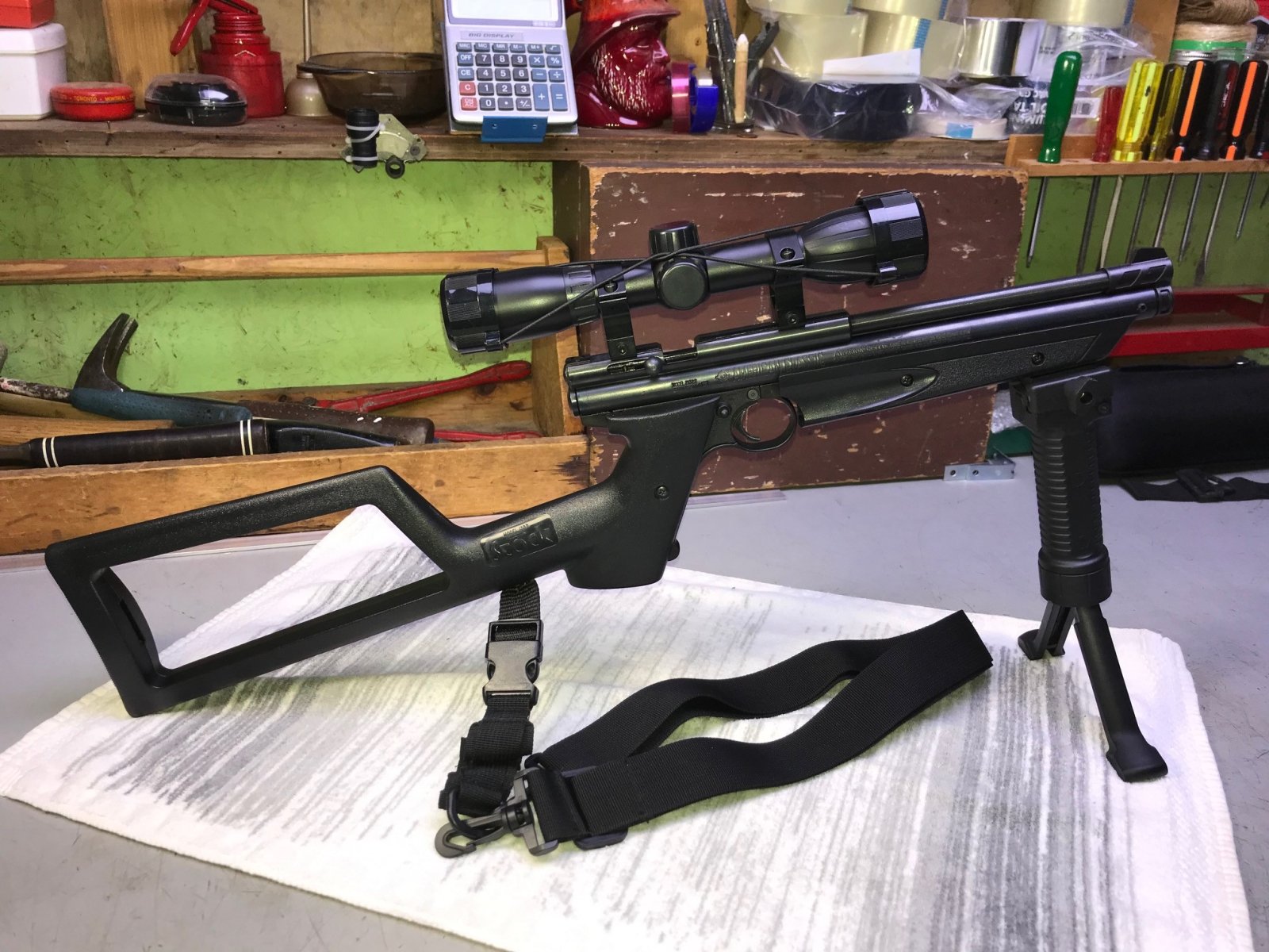 So I used an old Crossman American Classic 22, That I played with for a couple months. Replaced the stock, the barrel, the pump and polished the trigger to 1 pound click. Replaced the barrel supports added 2 picatinny rails, Some good telescope, a tripod and zeroed it parallel to the canon.