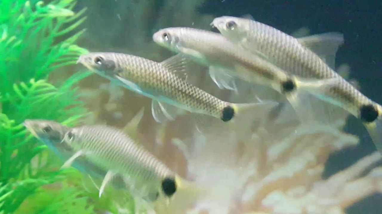 Hi all. These three guys got sent to me by accident about three weeks ago. They were about an inch long. I took a look, quickly categorized them as scissortail rasboras and put them in the 5-gallon tank. But as they grew I became unsure of that diagnosis. For one thing, they don't have the bands on each branch of the tailfin but rather one black spot right at the fork. For another, though they appear silver, when they turn toward the aquarium light they are bright gold. They also exhibit a light orange centerline from head to tail under certain lighting. Also they've already grown to 1.5-2 inches. Finally, though they don't turn down regular meals, they spend about 85 percent of their waking time nibbling algae from rocks, driftwood and plants, I mean they're on the go almost constantly. The rest of their time is spent attacking, chasing and playing with one another. They pay virtually no attention to their tank mates.