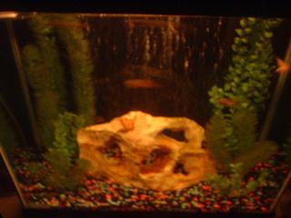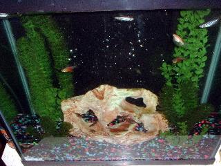 My camera has two modes, the outside mode (flower) and the inside mode (mountain). If I use the mountain with flash on you can't even see the lights on my tank and there is a bad flash. If I sue it without flash it comes out really blurry and my tank lights look yellow. Same thing goes if I use flower mode. If I put on the flash and put it right up agains the glass for fish pics it works okay but when taking the whole tank it is horrible.
