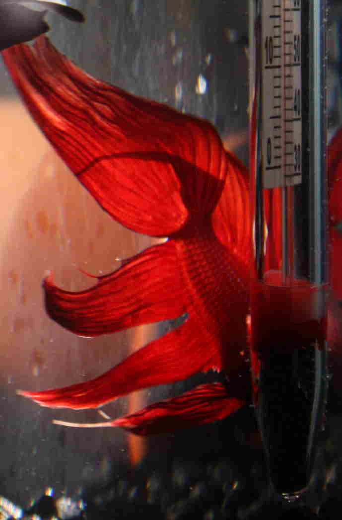 Another thing I noticed a long while back is the following. When I first bought him, his large anal fin ( I think that's the one below his body?) had a tiny hole right in the center of it, but where it attaches to his body. A few weeks back ( I didn't have the cories in there yet) the little hole seem to rip straight down and his fin is now split in half. So what was once ONE anal fin is now 2 anal fins! What's up with that? He was alone in there... plus it looks like it just ripped from where the hole was anyway. You can't tell his fin is not supposed to be that way. (I've attached a pic. of when he had the little hole)