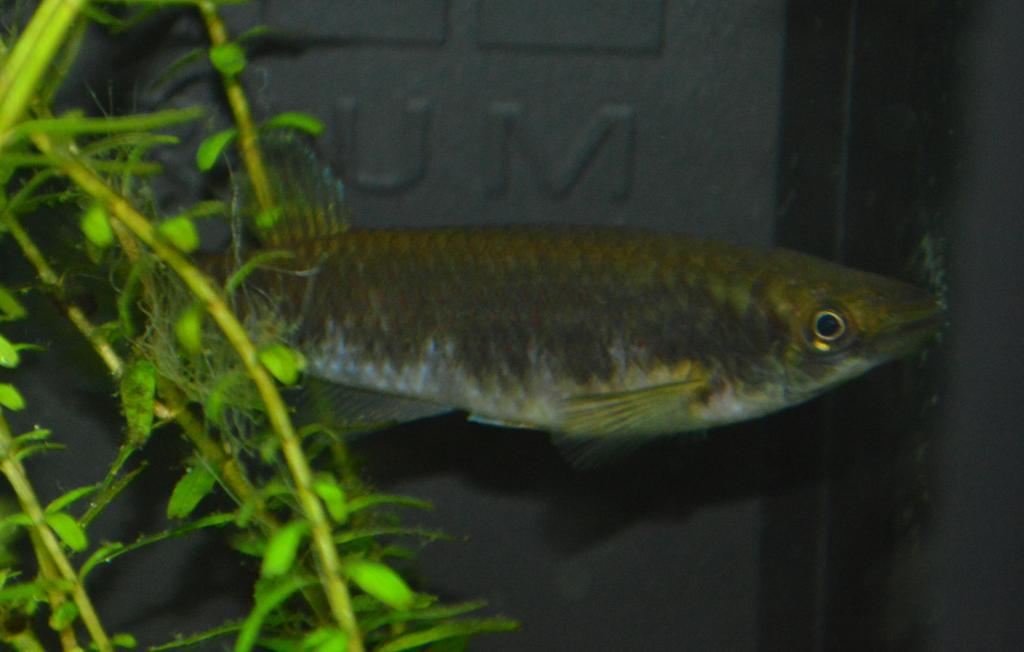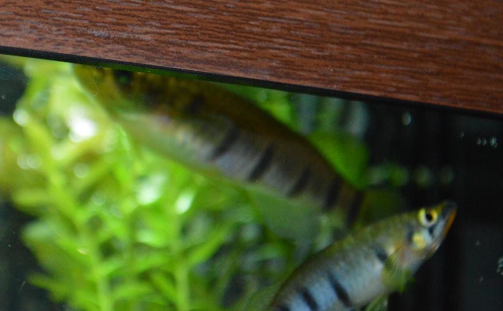 I purchased 8 Epiplatys dageti a couple of months ago, they were all about and inch long except for a couple of males which were a little bigger. I have never seen any bodies but there are only 2 left. This fish I assumed to be a female dageti. She just keeps growing and is about 3" now and far bigger than the male. I'm beginning to think she may not be what I bought. Any suggestions. I have a theory but I'd rather hear other ideas before planting ideas. The first 2 pics are of the male and female, althought the male is a blur on the 2nd one. By the 3rd pic she was getting nervous and has lost her stripes. Very hard to get a pic as all she does is hang about in the top corner and eat.