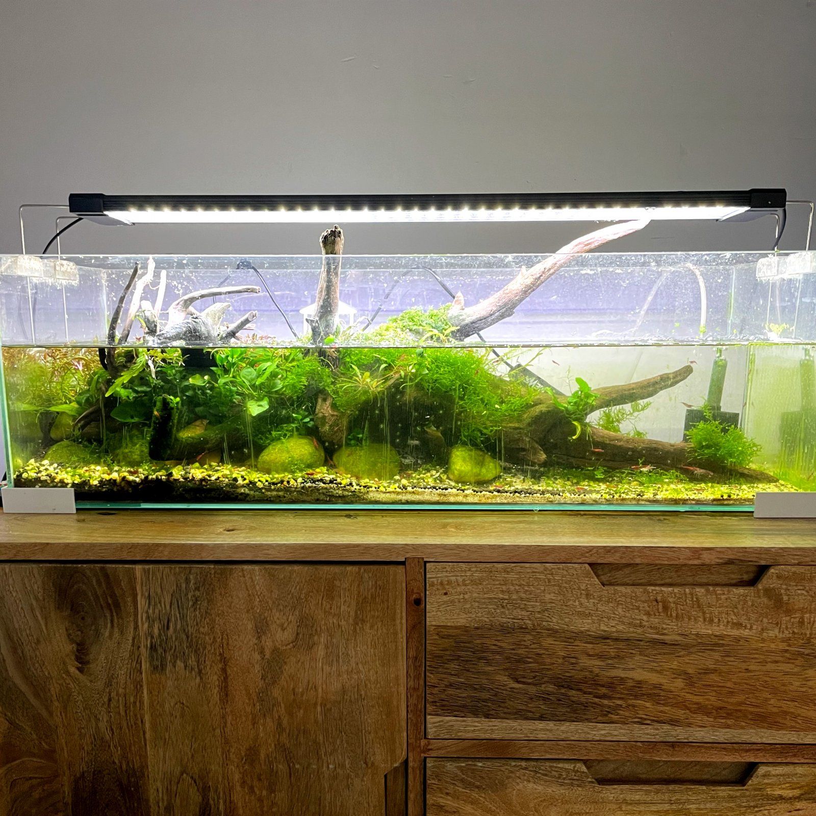 Hey guys. My old 15gal long (when fully filled) is currently just a red cherry shrimp colony. It’s a pretty basic driftwood scape with Christmas moss, anubias and some rotala in the background that I’m hoping will eventually break the surface and grow emmersed.