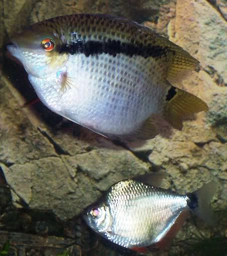 click thumbnails for fantastic pics adonis pleco Acanthicus adonis Male filament barb Barbus filamentosa Female filament barb (note smaller dorsal fin) disc tetra Brachychalcinus orbicularis festivum Mesonauta festiva +disc tetra freshwater flatfish {tentaively}Brachirus harmandi