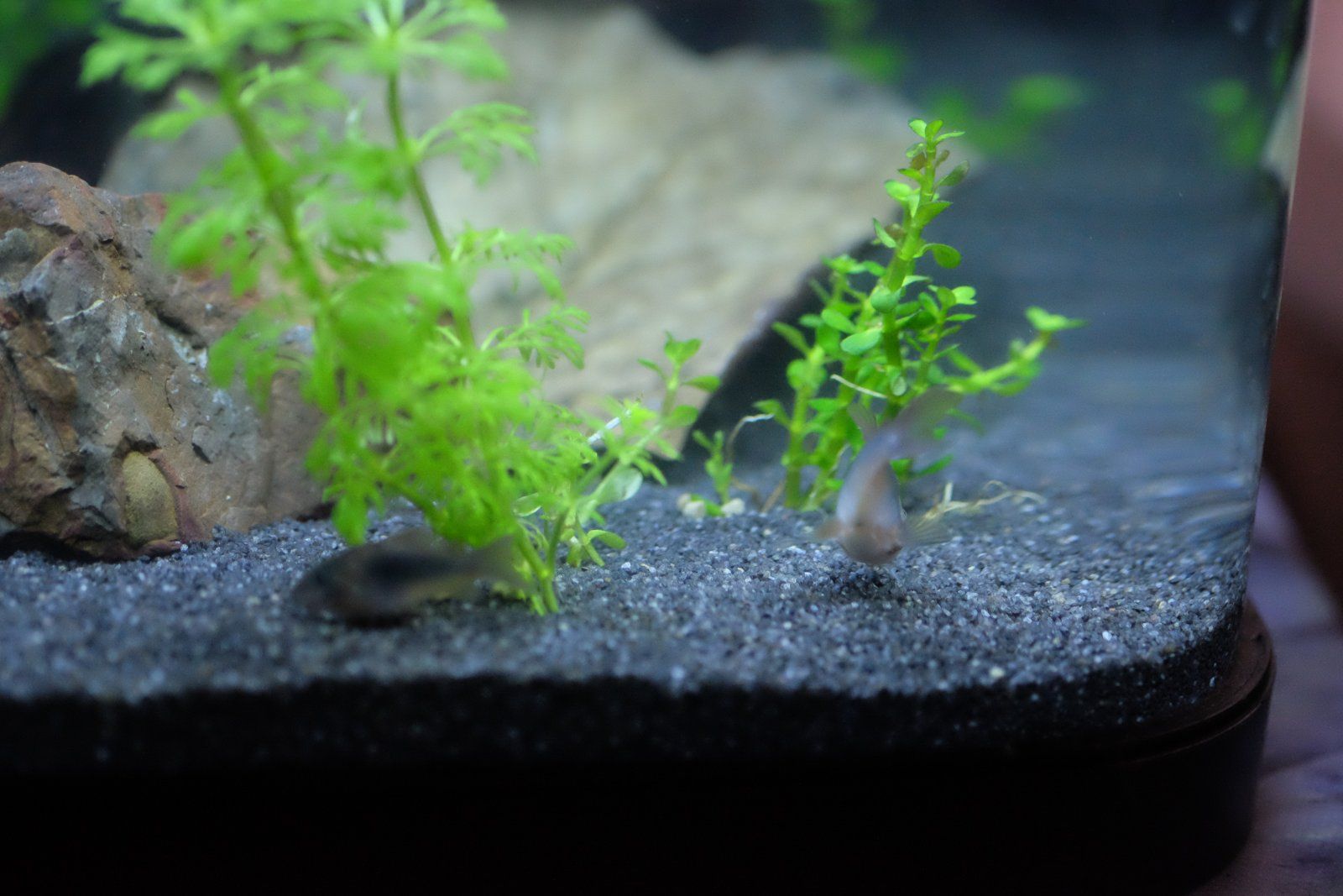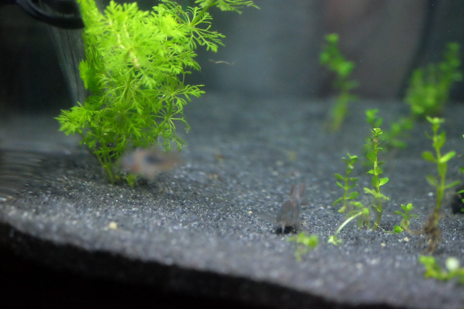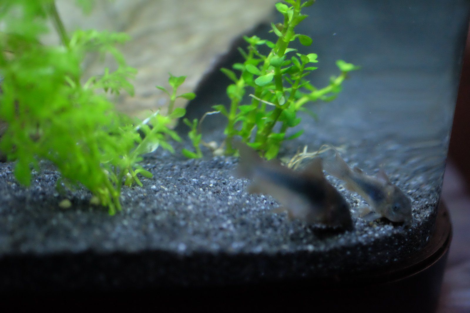 My heart sank and I began looking by moving decor. There's only a couple of pieces of wood, a stone, an almond leaf, and some small live plant stems in there, where could he be hiding? I was even wondering if he'd jumped out somehow, despite there being a lid and it being a cory. I lift everything up, can't see him. Lift the sponge filter a bit, can't see him. I'm wondering if the others could or would have eaten him, when I look again and he's at the front, looking a bit spooked.