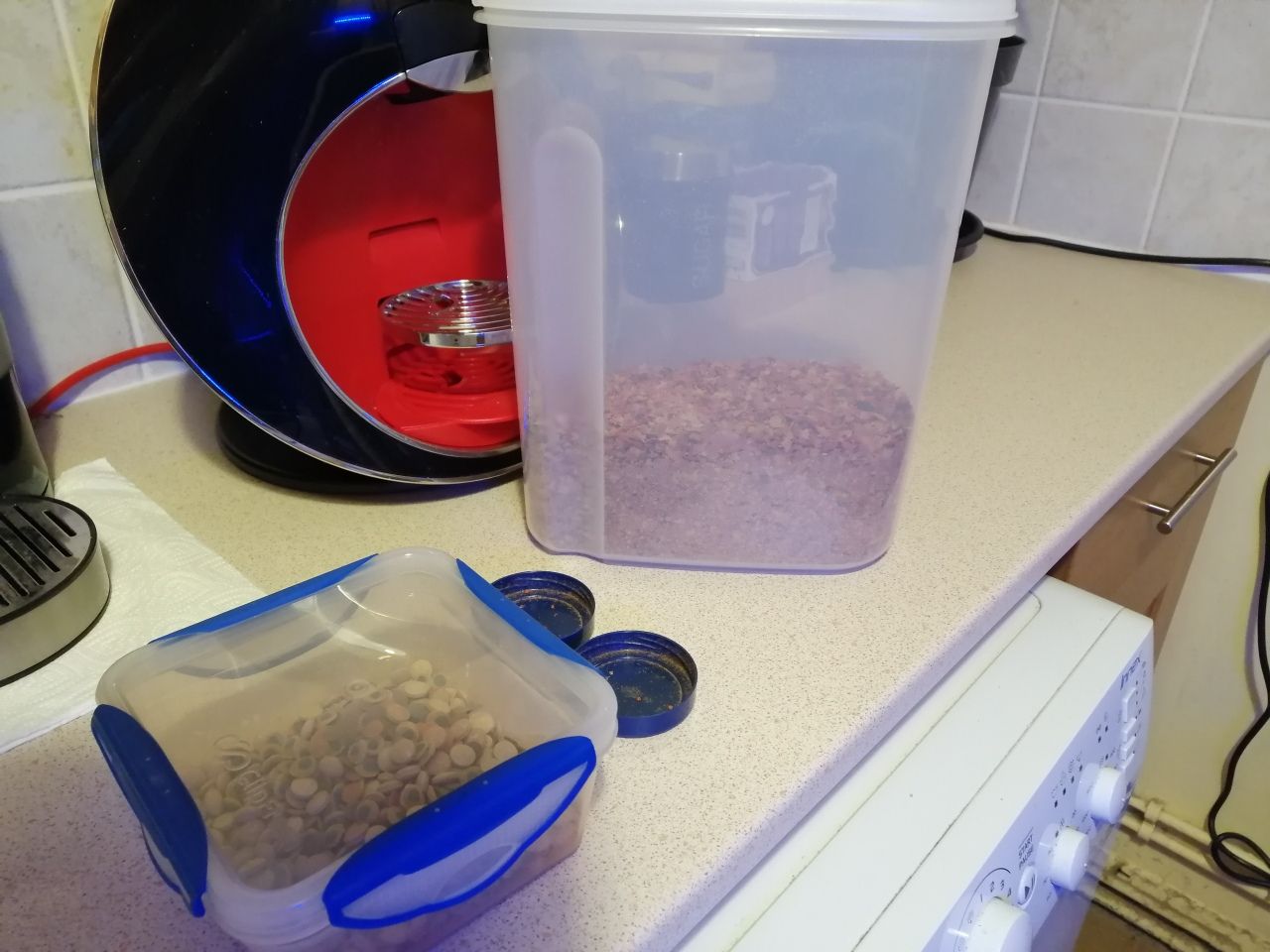The two dark blue things are old food tub lids that I use to give the hooligans their food through their aquarium flaps. I use nitrile gloves for all food handling too. Fish are happy and healthy, I never get any uneaten food left on the substrate, so they must be enjoying their unorthodox feeding routine