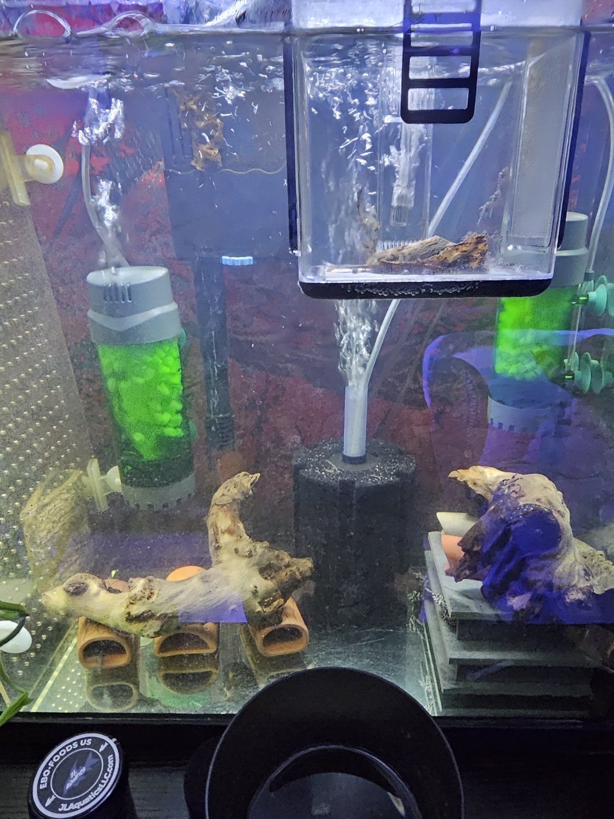 In the past couple of months we set a 20 gallon fish tank in front of a sheltered window on the west wall. Used to watch the sunset through that window, but no more. For the pst few years that window has been shielded by a narrow three season porch where we enjoy morning coffee sometimes and a quiet moment in the evening watching the sun drop under the mountain. Then our newly acquired mollies, at least one anyway, blessed us with birth. Linda, a true animal whisperer who has the pond fish, squirrels and many birds eating from her hand, could not abide their being lunch for their parents. A five-gallon tank immediately ensued. It was one that lay on a shelf in the basement unused for many years. Eldest daughter had once housed a Betta in the tank. The betta was part of her lessons in responsibility. Linda rescued 9 of the fry, five have survived what I imagine now where not ideal living conditions. They have grown from a pair of eyes into critters that are beginning to actually look like fish. The bug had now bit and we began to reimagine the dining room and talk about repurposing it. In doing so many memories have resurfaced so the thought of making massive changes were both bitter and sweet, but a third tank soon arrived and took its place on an inside east wall. It has fully cycled and now holds three mollies, a big black male that sometimes shimmers in a deep and velvety purple and two golden females, one of which is half black. Linda choose them from a large selection at the local fish store, a small retail establishment with a large selection of fish to choose from. We do not know what branch of the Molly family these new pets are from but we soon will.