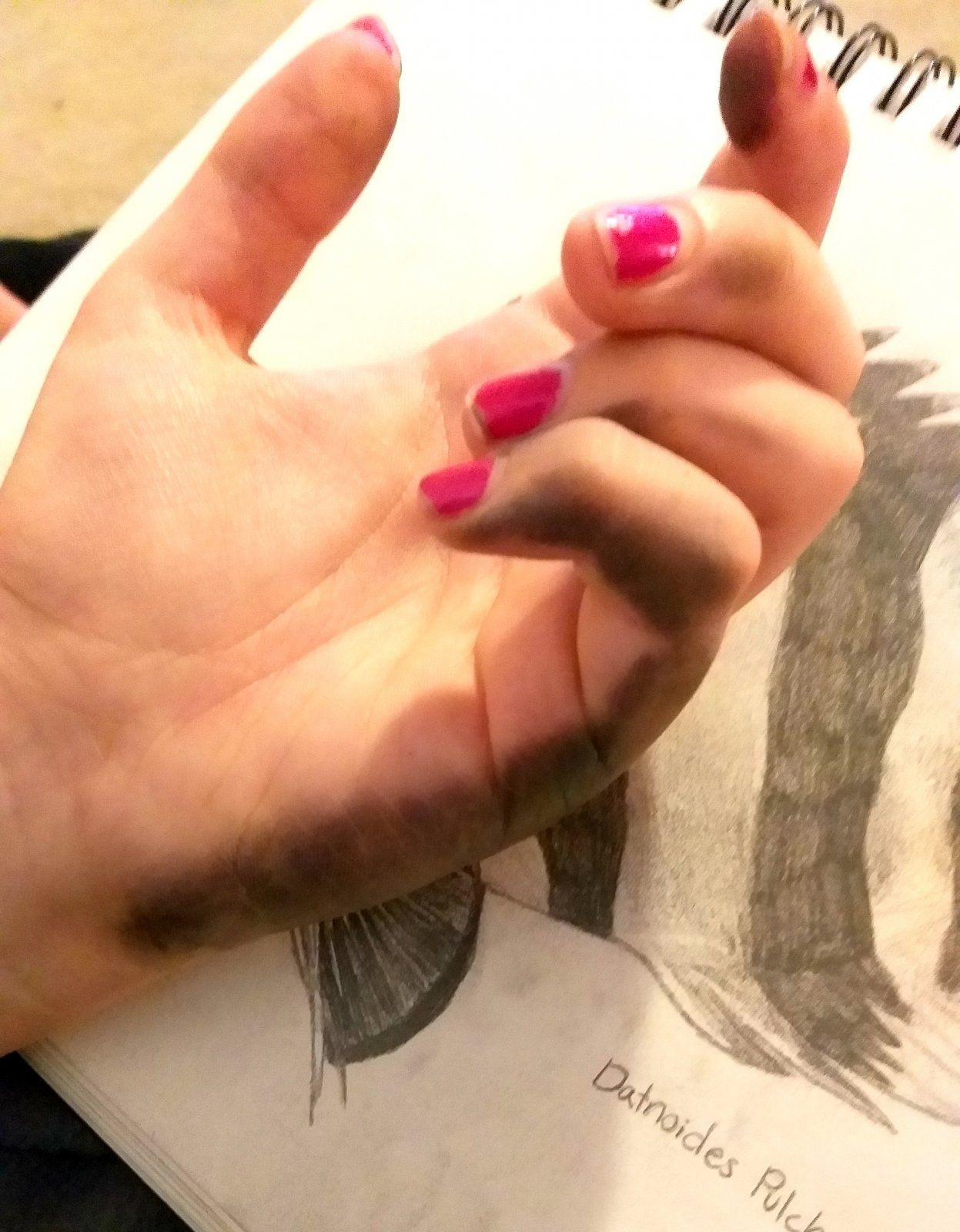 My hand looks like that after drawing for a while too. I really need to put a piece of paper under my hand and blend with something besides my finger..... but I don't lol.Thats the only full page drawing I've done, and this is my hand after working on it lol