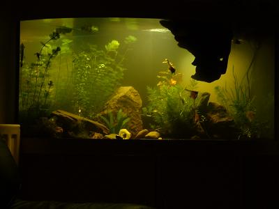 Very nice. Ive never had problems getting my wood to stay down, wondered what was floating, kinda looks spooky lol. My wood doesnt discolour the water much either but does tone it down a bit and makes it look more subtle lighting effect.