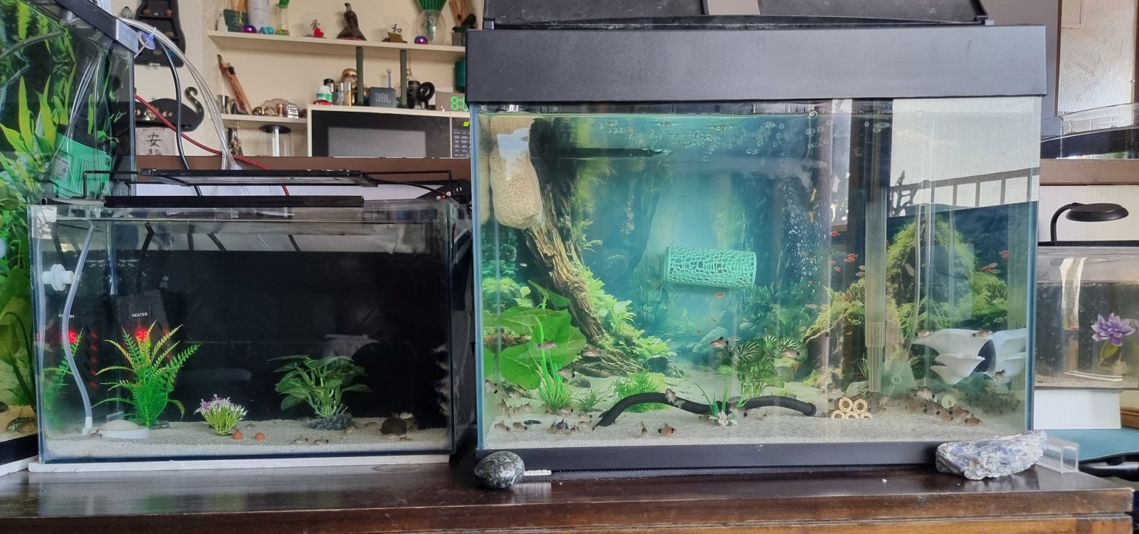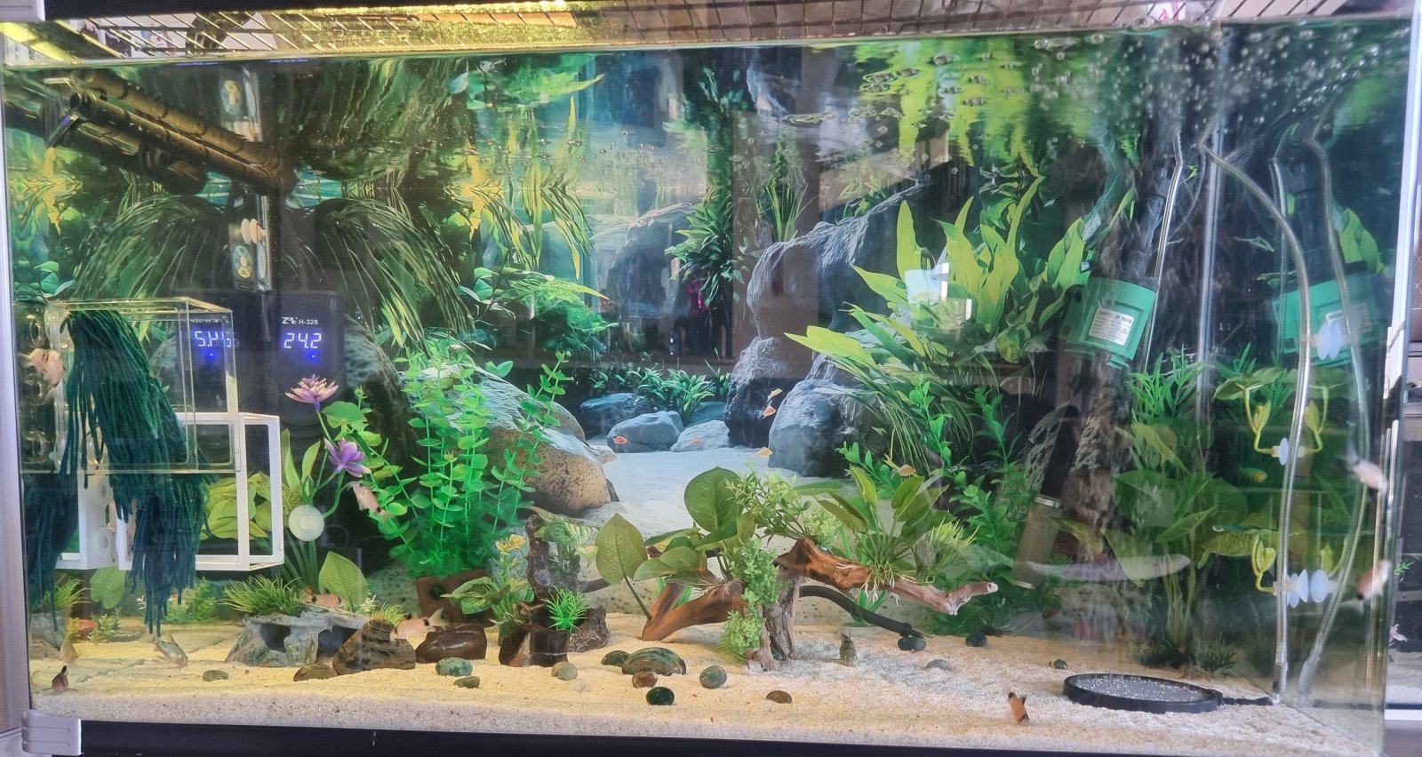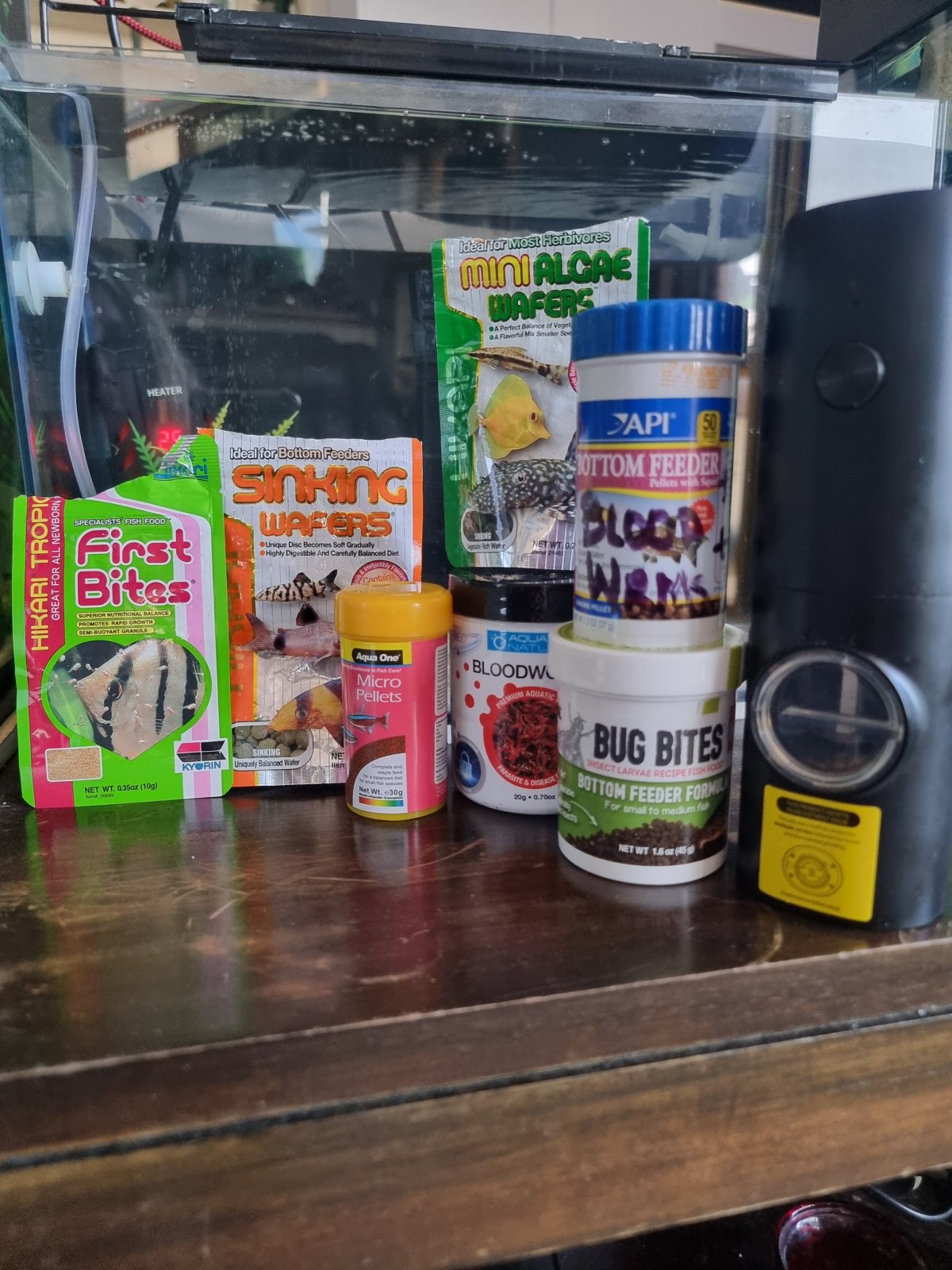 so I typically add algae cookies in with this mix, but I dust up bug bites, a custom blend of 3 sources of flake food, and add in a small scoop of 50% protein fry food ( this is my "regular" blend, but every other time I substitute another staple for the fry food ) I only feed every other , or 3rd day, so they are hungry... I feed enough, that everyone gets fed, doing this lets me see some of the tiny varieties of hillstream's. like my red or blue tails, that are just over an inch long... fish come out of every corner on most tanks... my worm line pleco, and male sailfin tetra come out of their caves... the hatchets all come out of the roots... it's a glorious sight...