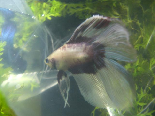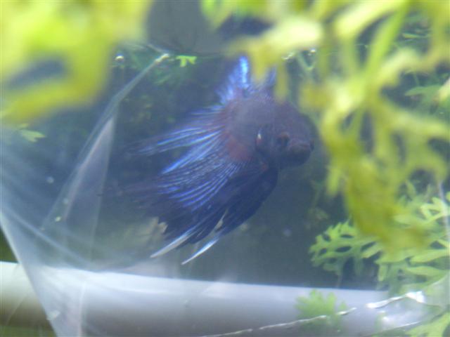 went to one of my local places looking for tank deviders and decided to see what girls they had in, i dont usualy look at the males as they always only have VT in...not today! no girls and i didnt see the row of cups on a shelf above the tanks at first but thoght id have a look at the boys. first one i picked up was a pure snow white DT male who very nearly came home with me. then i looked tru them and almost all were DT! i came home with a red marble, his fin are in good condition other than a little curling on the tips, and what apears to be a blue lace, black orchid DT, his fins are a bit tatty and i thought he may have just had a split tail but his dorsal fin gives away that hes a DT. afew pics. the dark one was difficult to photograph, flaring away! the marble is a pouser! and one of my little blue marbl girl i got on ebay a few weeks ago.