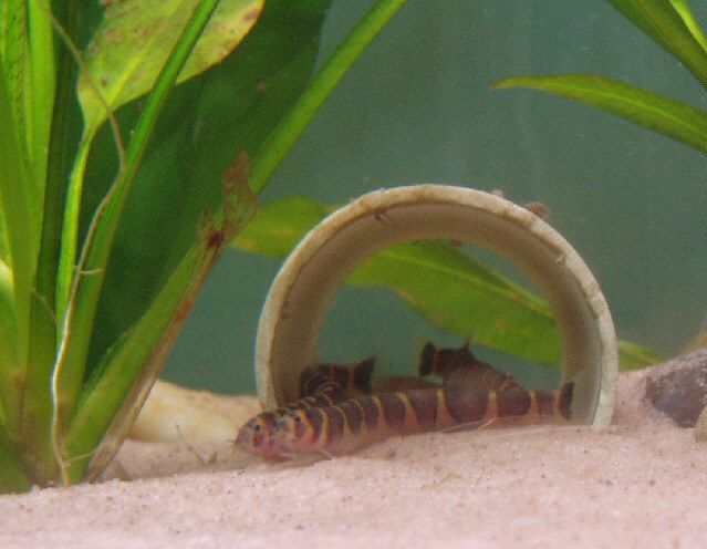 Did my usual headcount this morning on my tanks and happened upon 3 of my 4 khulies snuggling up in one of the plastic tubes in their tank. I went off to find the camera expecting them to be gone when I got back, but luckily I managed to snap them