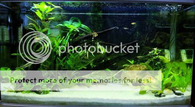 You can see how much my Wendtii has taken off. The roots go for miles all over the wood. The Anubias on the wood at the front has nearly doubled in size too. It didn't attached to the wood last time, so I've moved it onto the top of that piece of wood, hopefully it takes off. The Tropica's outter leaves started looking a little sad and dying, I pulled off what I could, and they're starting to perk up a bit now and reproducing little plants of their stems. (Love how they shoot off upright stems by the way!)
