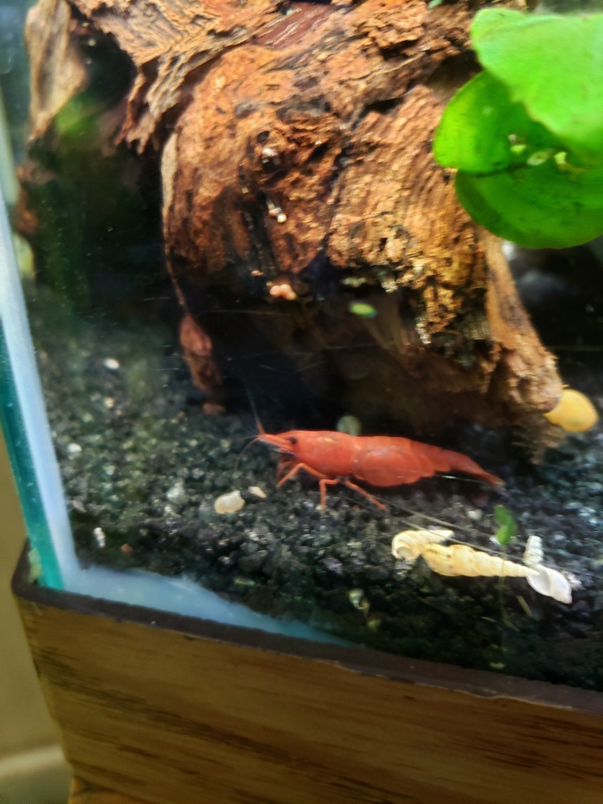 My nicest looking large female shrimp. I do have others with similar or better coloring, but they tend to be smaller. She was born in my tank going on two years ago. Most of my large shrimp died when I had a tank crash. She is currently my largest red cherry shrimp as well. I only just recently put her in a breeding tank. Up until now she had been in my DCL tank, where the shrimplets get eaten quickly. I am getting some blue shrimp in the mail next week (hopefully along with my halloween vampire crabs). Do you guys have a favorite invertebrate in your tanks?
