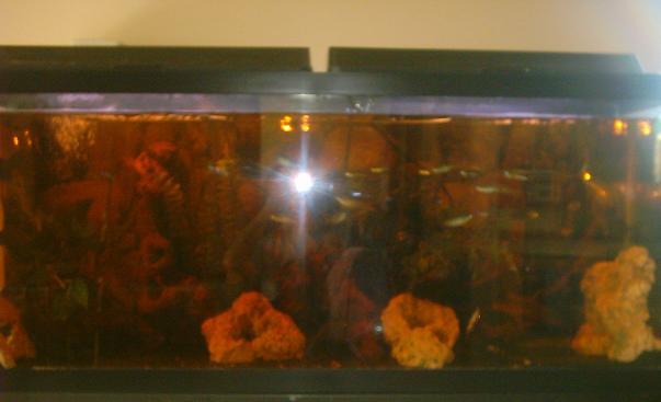 Also, take the picture at an angle - Stand above the tank just a tiny bit so the canera is facing the bottom of the back of the tank, and not strait. That way the flash doesn't reflect back at you. I'd turn on all the tank lights, turn OFF all the room lights and make the room as dark as possible... ^^