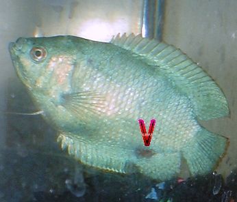 Fish Symptoms (include full description including lesion, color, location, fish behavior): Dwarf Pearl Gourami was living in a 30gal establish tank (1 year) with 5 serpae tetras, 2 platies, 2 cories. No new fish. He is the newest, about 4 months. Noticed 2 weeks ago a small red lesion on his lower fin. Moved him to the hospital tank 1 week ago. He's listless. Not eating. Stringy poop? (where is the anus of this fish anyway?) This stringy stuff is not coming from the rear end. It's more near the front, near it's feelers, and keeps getting tangled up in them for that matter. It's not coming from it's gills that I can see though.