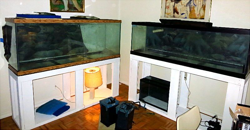 As you can see I also paint my wooden stands. I use a semi-gloss exterior paint for this. Stands will get wet repeatedly over time. I never finished those stands. They were designed to have a finished look if I wanted to do so. Instead the 125 has a 40L under it and the 150 has supplies and a canister filter under it.