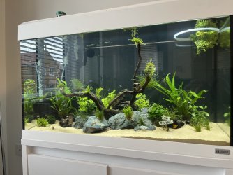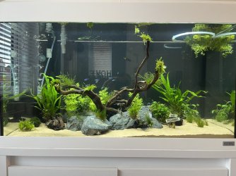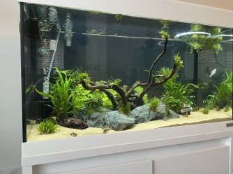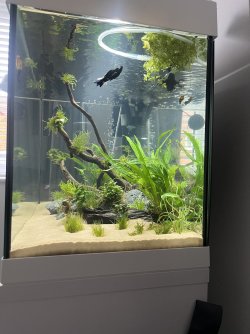 Alex the Molly at the end does look a lot smaller than the other when I look at themNice one. Your frogbit is already getting some nice long roots. I'll send you a picture today or tomorrow on here of my frogbit. I really like it. The sand looks really nice as well in your set up, are you happy with it?