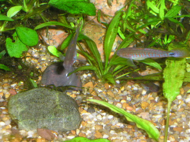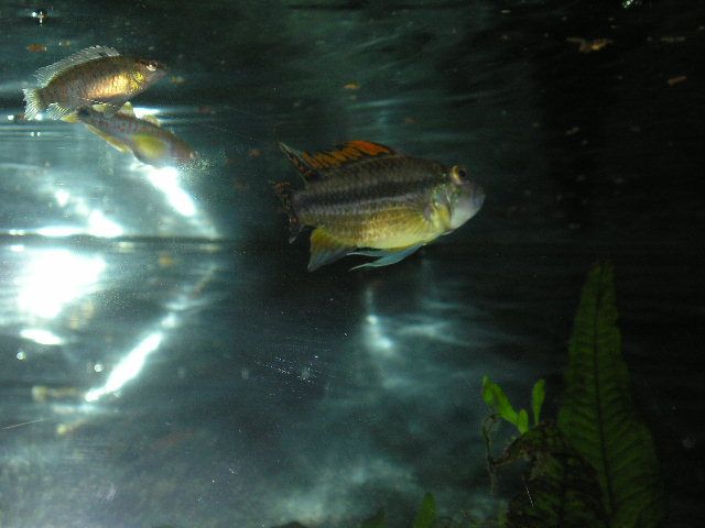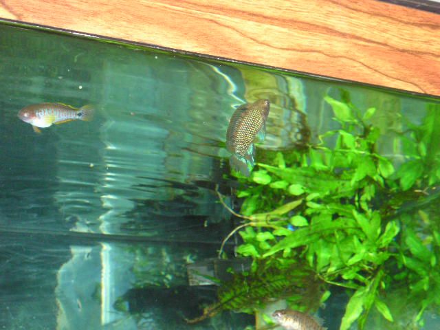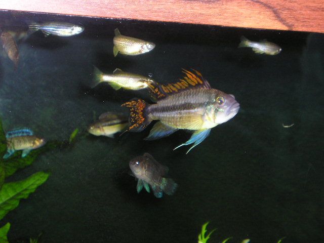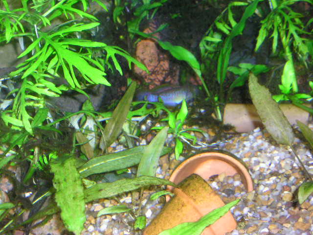 He finally stopped chasing the nannacara (He has no females, and mistaked the nannacara as another cockatoo, but I think he realizes that she is another species now)