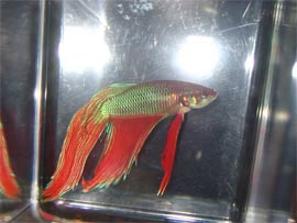 So I was in walmart, looking for a baseball magazine, and after I found they don't have it, I thought I'd visit the betta, so I took a spin by, was looking, all looked good, so I browsed the other fish, and.. low and behold, I saw this poor betta in the top corner clinging to the side of this tiny random floating plant, there also happend to be a dead african clawed frog in the same corner. there were african rainbow fish, redtail shark, and an alive african clawed frog or two, I watched this poor guy for aruond 10-15 min. he sat there.. and sat there.. noticed I was noticing him, came a little closer to the glass to see me, went right back... and finally i saw him swim away from his spot for a sec. he just decided to flare and chase away the rainbow. so I had to walk halfway around the store, to find someone had them page help, and no one came, so then I saw someone I know, that works there. and she paged, finally someone came, the kid was a dull as a box o' rocks. I told him there was a betta in there and it had to be taken out or bad things will happen (inside the tank, and outside, but I didn't exactly say heh) so he says "uhh.. I can put him in a bag" so I said whatever, and.. I really do not have any room at all for another fish, but I have one now. he's in my little holding tank.