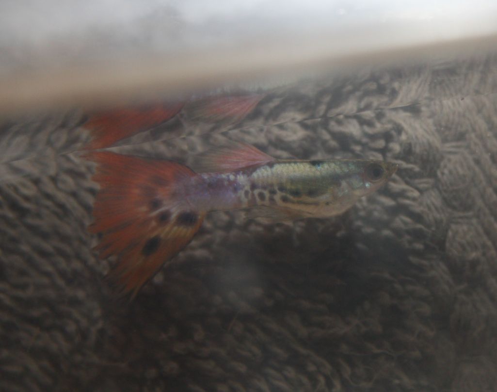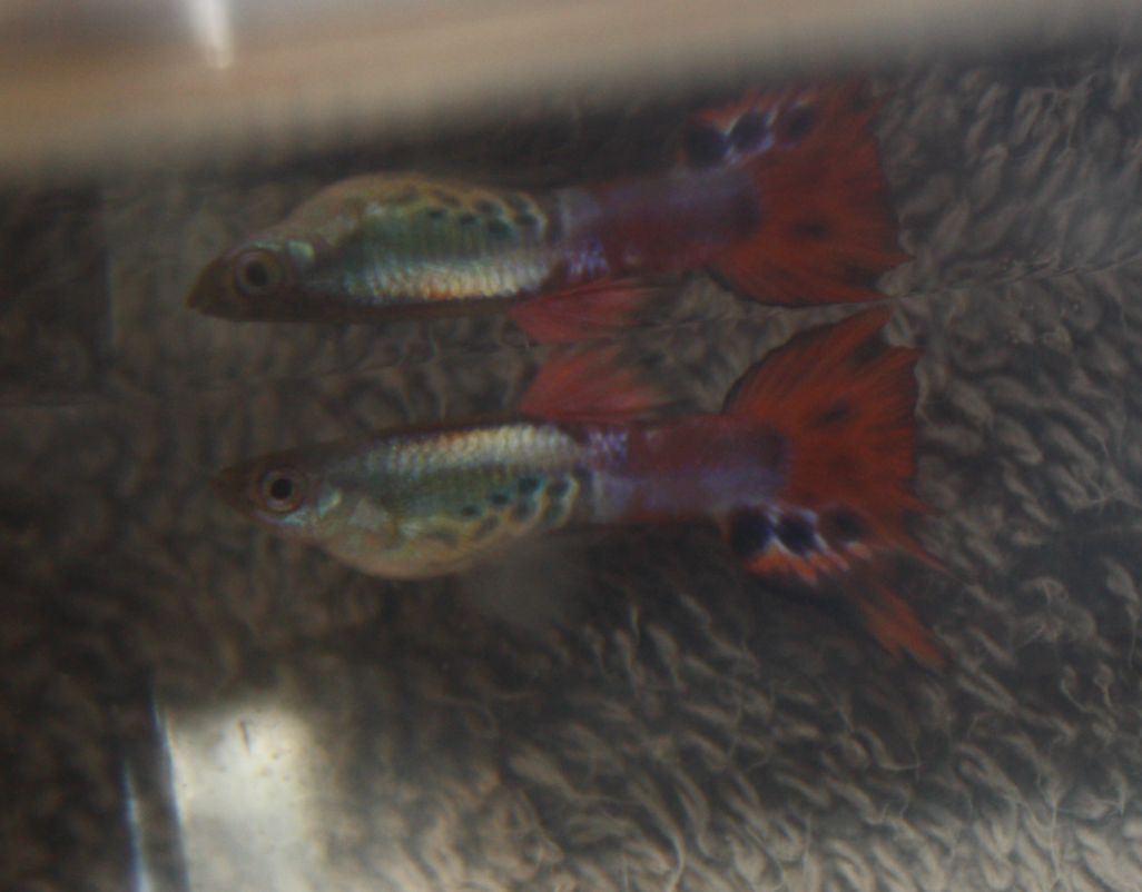 That is very helpful information, i did not know that some types of guppy grow faster than others.The mothers came from a line of blue ghost guppies (this is a very fast growing strain of mine). In this specific strain of blue ghost guppies, the females carry the magenta gene dominantly (YY females, so, not XX females). These virgin females have been crossed to red mosaic dumbo males. Those dumbo males are tuxedo bodied but carry snake pattern recessively. So, all male offspring showed magenta on their back bodies and finnage with a metallic chest (comes from the blue ghost guppies) with a snake pattern on their chests. Female offspring were all grey bodied (as their mothers) but without the magenta saddle and black finnage. YY females have dominant traits but pass on those traits only to their sons. The female offspring do show mosaic -snake pattern in their finnage.