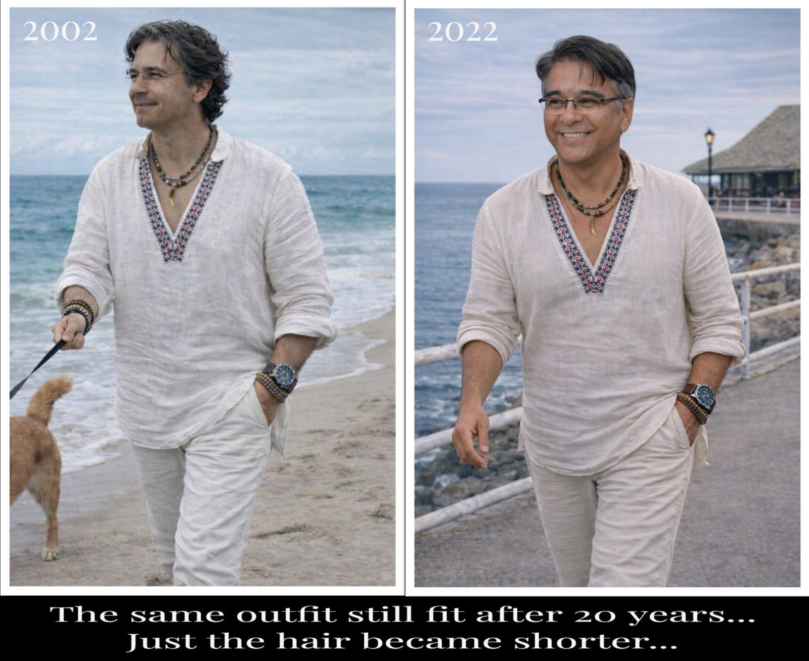 Overhere I've redone a photo outfit after 20 years. The old outfit and necklace still fit after two decades. It was made almost 4 years ago. And the funny thing when I looked at both pictures, I do look surprisingly younger in 2022 than in 2002... Just the hair got shorter with age and some grey at the temples...