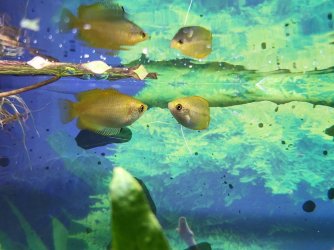I have 3 sunset honey gouramis - one is obviously male (not pictured) and one I'm pretty sure is female (the one on the right in the first picture) and one I'm not sure about (the one on the left, and in the second picture). He/she used to have a more obvious stripe down the side, and has now developed a spot of darker color on the botton fin. He/she is not as colorful as my obvious male, not as bright yellow and doesn't have the dark throat. His/her coloration is in between the two others. Any ideas on the sex? Hope the pictures are clear enough.