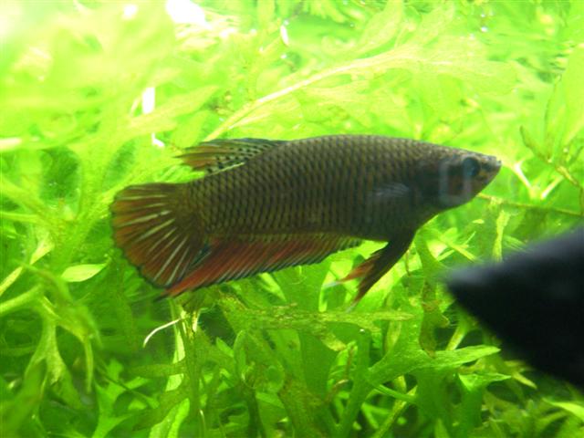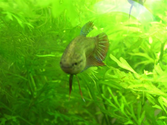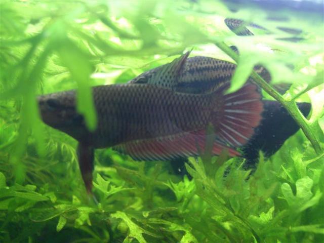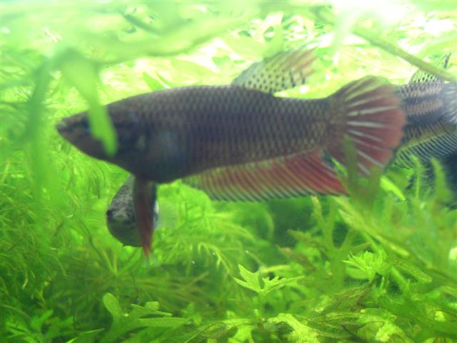 the youngster i bred 3 months ago. he didnt have the best start in life so is a bit small for its age. its in with a tank of girls at the moment. no egg spot, but no big "flare face" when it does flare. showed it a mirror and although facinated, no flare. looks a bit fat as this was just after a big meal of bloodworms.