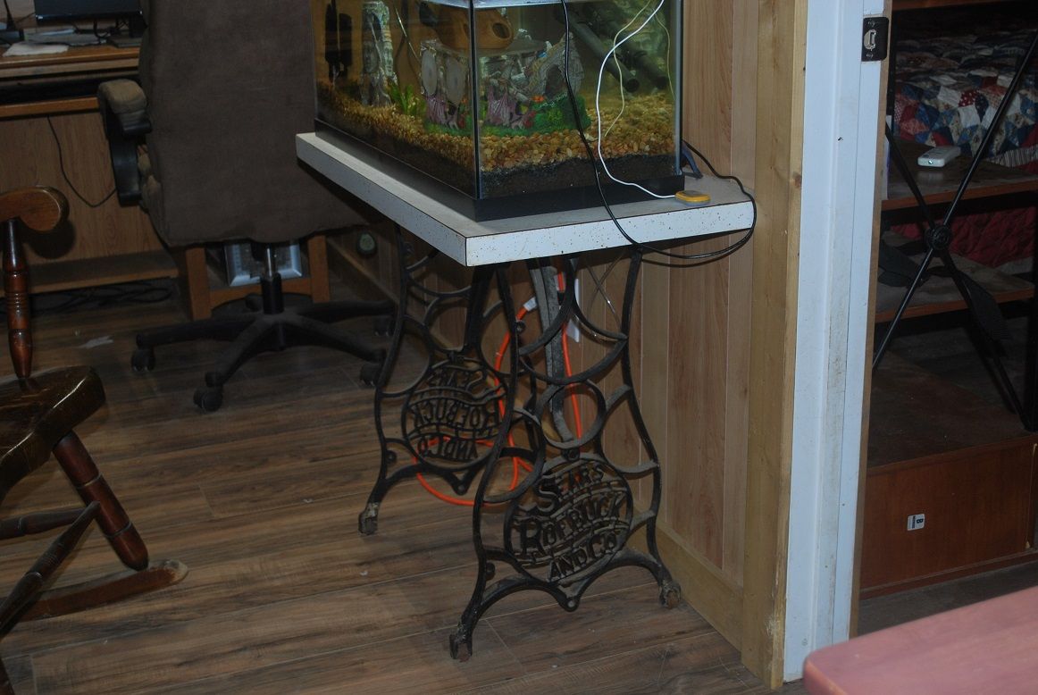 You might find his aquarium stand interesting because I used a table that my dad made when I was just a kid. Dad made this for Mom about 55 years ago when I was about ten years old. The base is made for what was left of Dad's mother's old antique Sears & Roebuck sewing machine. There was a large peddle at the bottom to drive the sewing machine and in those days say in the 1930s (guessing here) everything was made of metal, no plastic. But the peddle is gone, I have no idea where the rest of this is.